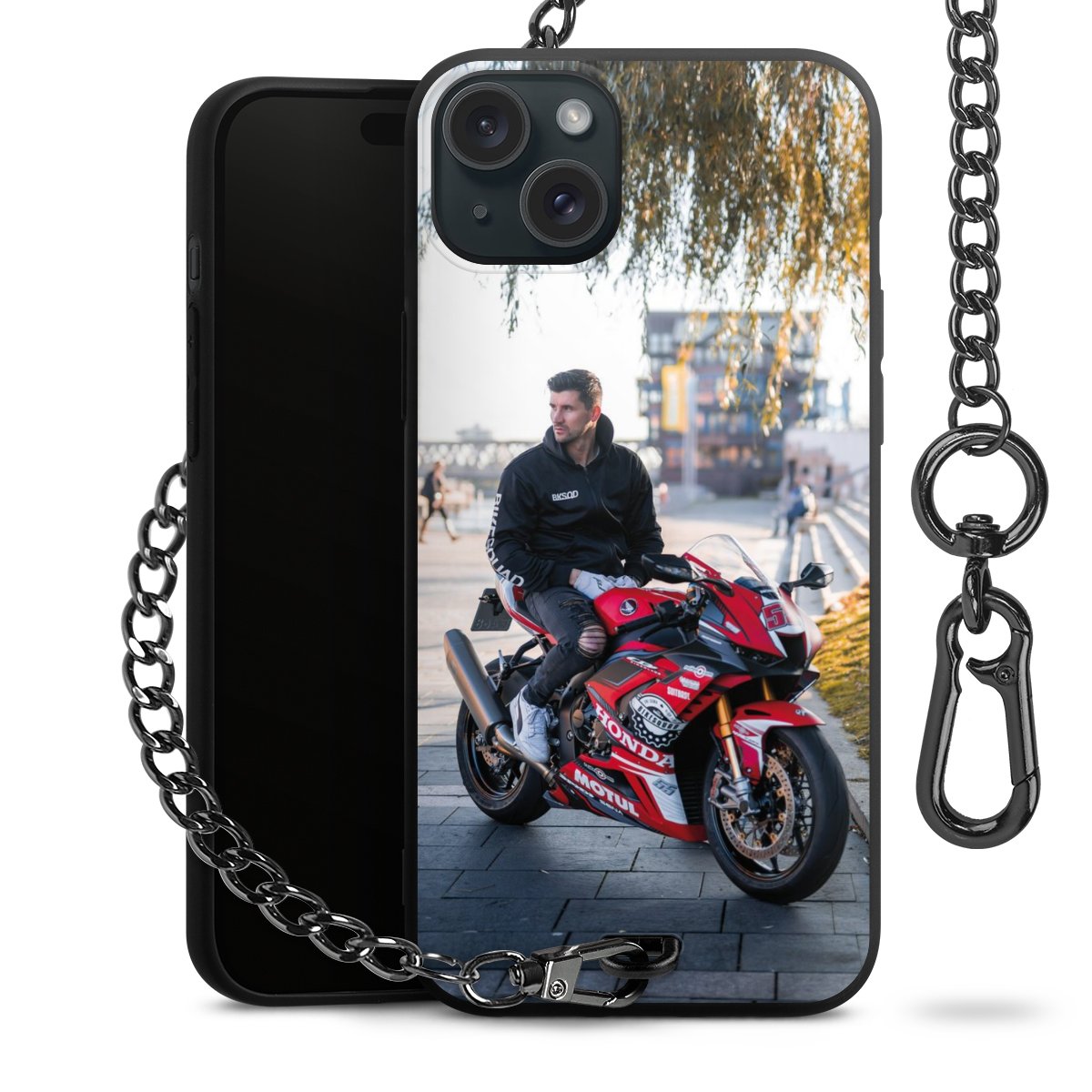 • Mattschwarze Handyhülle mit Metallkette