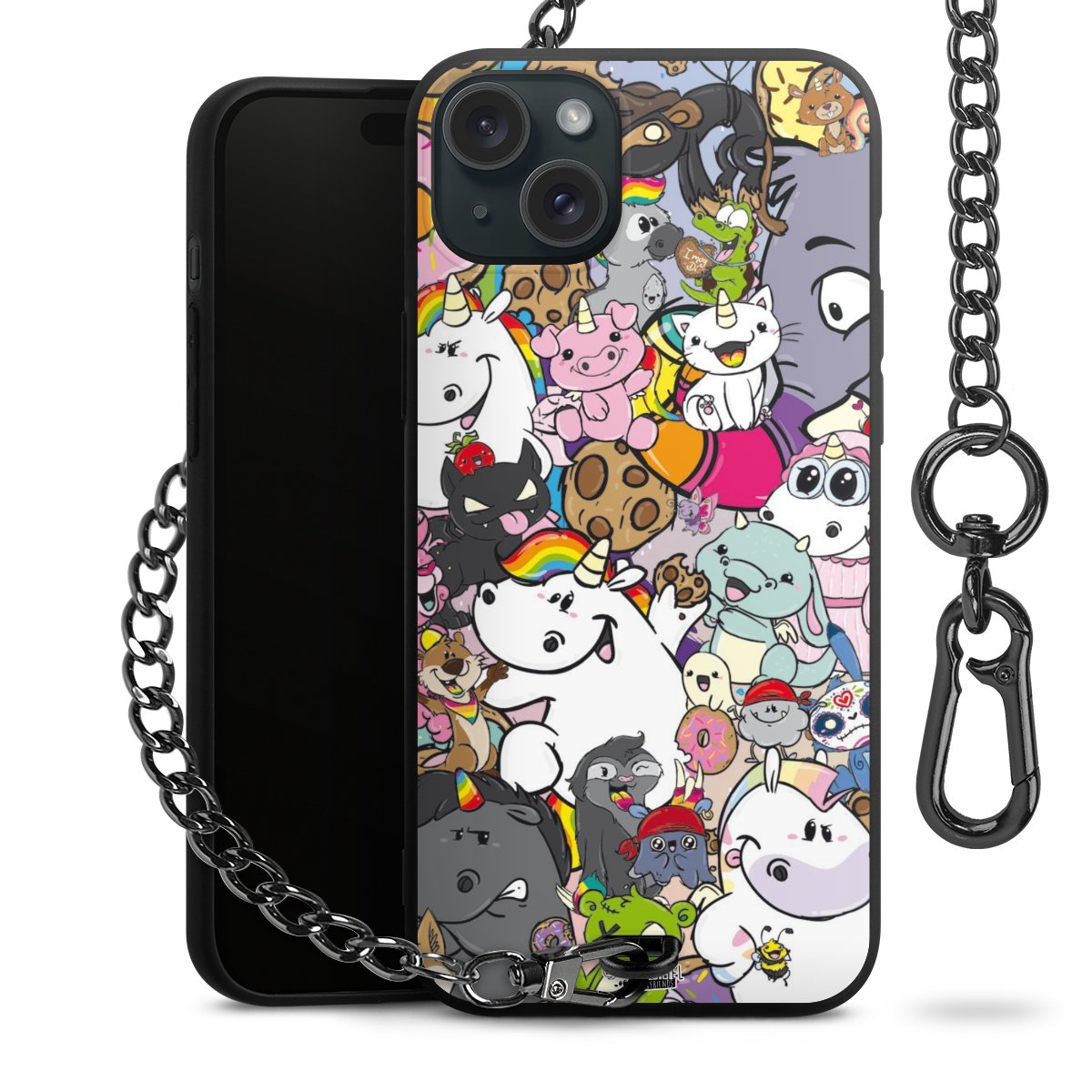 Die Handyhülle verfügt über eine mittig am unteren Rand platzierte Öse, an der die Metallkette stabil befestigt ist. Bestelle die Hülle einfach für Dein Smartphone-Modell, dann passt sie wie angegossen und Du brauchst sie bloß einmal anzudrücken. Handy in die Tasche, Karabiner an den Hosenbund – schon kann die Party starten.