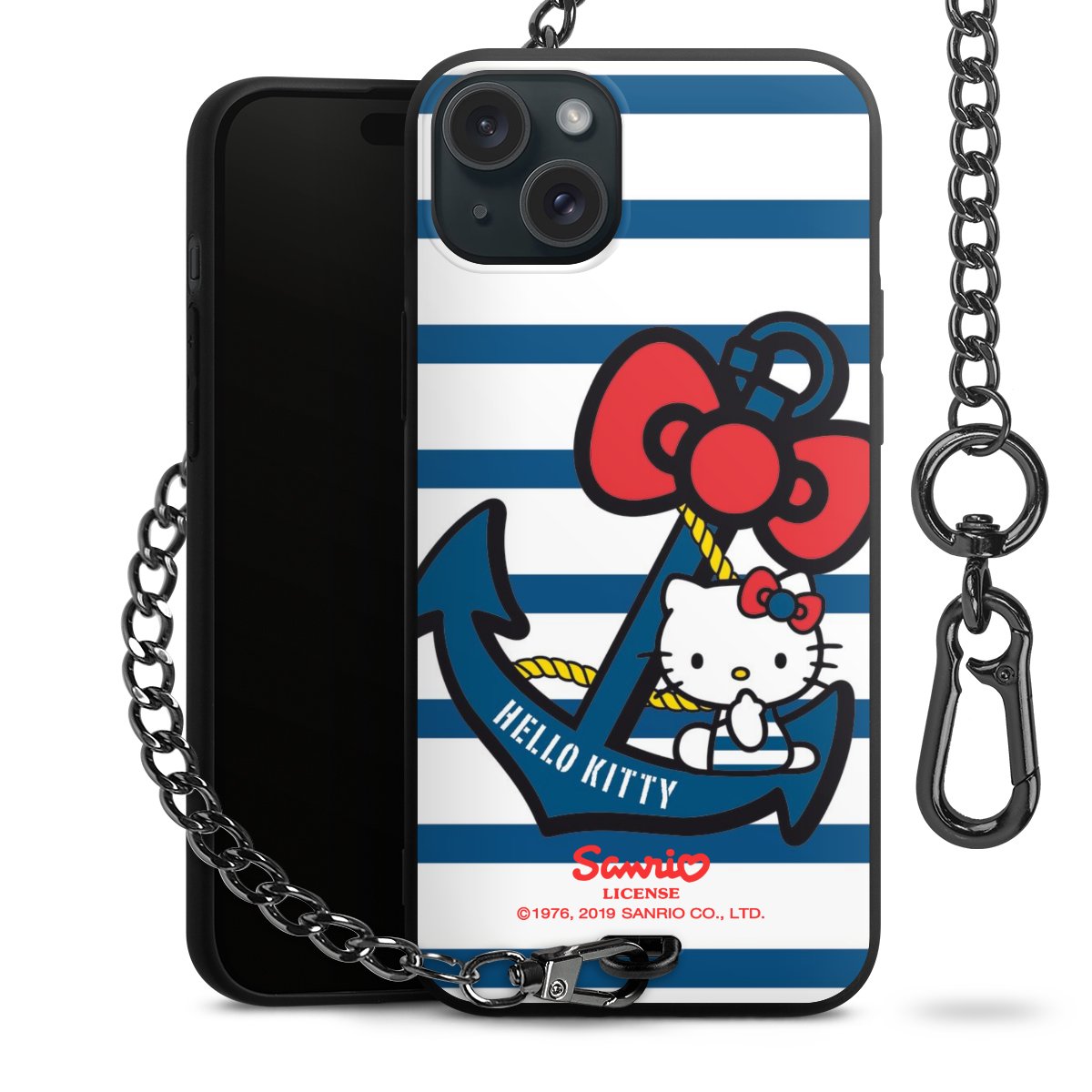 Die Handyhülle verfügt über eine mittig am unteren Rand platzierte Öse, an der die Metallkette stabil befestigt ist. Bestelle die Hülle einfach für Dein Smartphone-Modell, dann passt sie wie angegossen und Du brauchst sie bloß einmal anzudrücken. Handy in die Tasche, Karabiner an den Hosenbund – schon kann die Party starten.