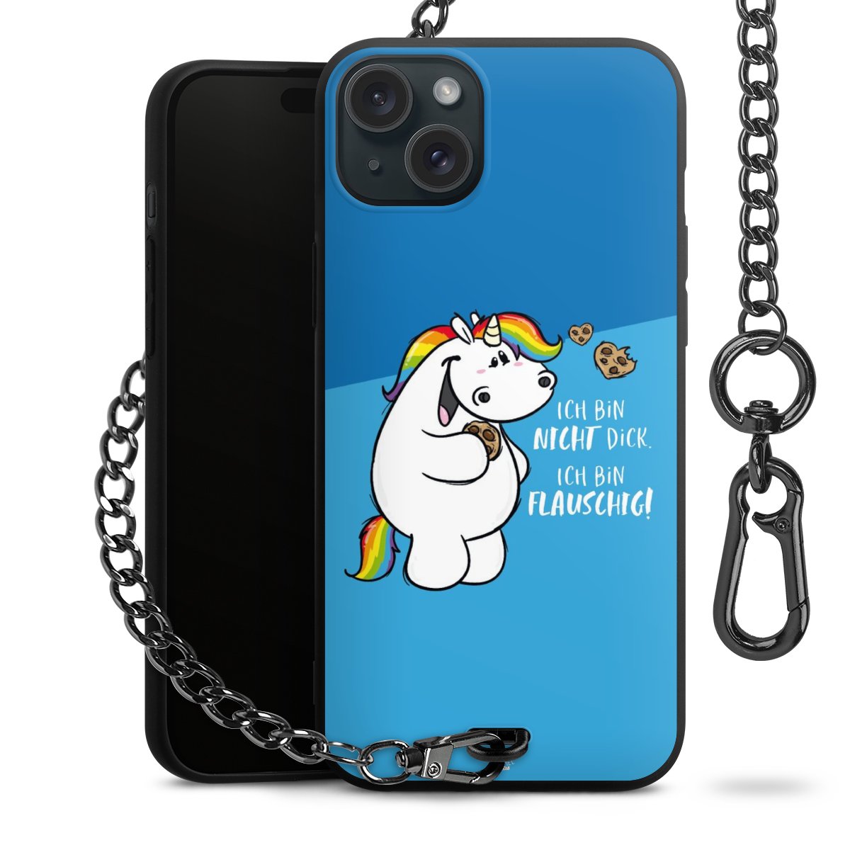 Die mattschwarze Silikon-Handyhülle besteht aus robustem TPU (thermoplastisches Polyurethan). Sie ist flexibel und schützt Dein Smartphone vor Stößen und Kratzern. Die Kette sowie der Karabinerhaken sind aus Metall in Gunmetal-Optik gefertigt. Für dieses Produkt kommen ausschließlich TÜV-geprüfte Materialien zum Einsatz.