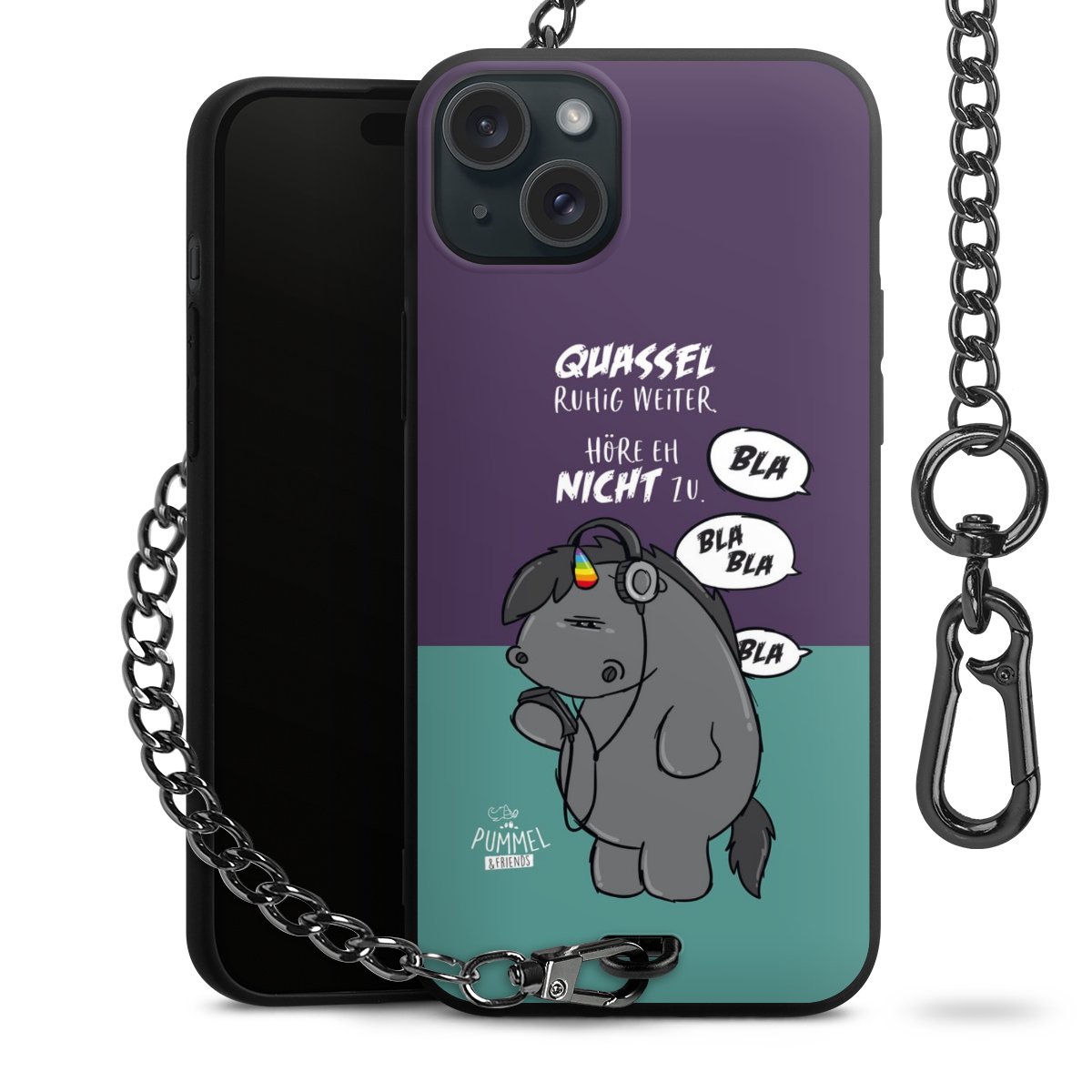Die mattschwarze Silikon-Handyhülle besteht aus robustem TPU (thermoplastisches Polyurethan). Sie ist flexibel und schützt Dein Smartphone vor Stößen und Kratzern. Die Kette sowie der Karabinerhaken sind aus Metall in Gunmetal-Optik gefertigt. Für dieses Produkt kommen ausschließlich TÜV-geprüfte Materialien zum Einsatz.