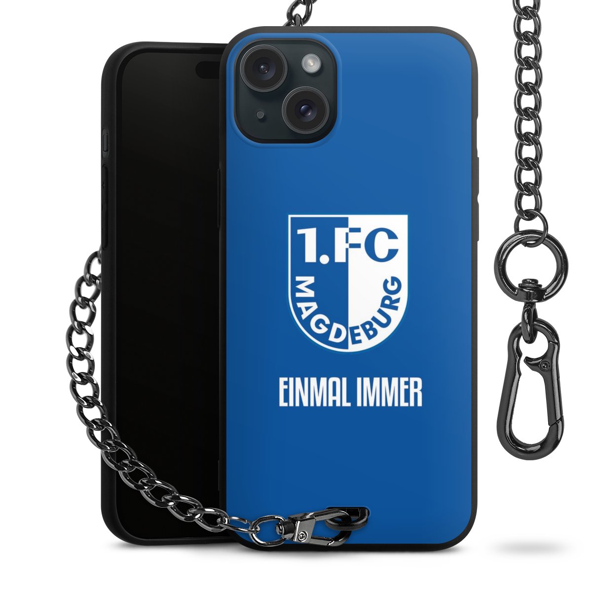 Die Handyhülle verfügt über eine mittig am unteren Rand platzierte Öse, an der die Metallkette stabil befestigt ist. Bestelle die Hülle einfach für Dein Smartphone-Modell, dann passt sie wie angegossen und Du brauchst sie bloß einmal anzudrücken. Handy in die Tasche, Karabiner an den Hosenbund – schon kann die Party starten.