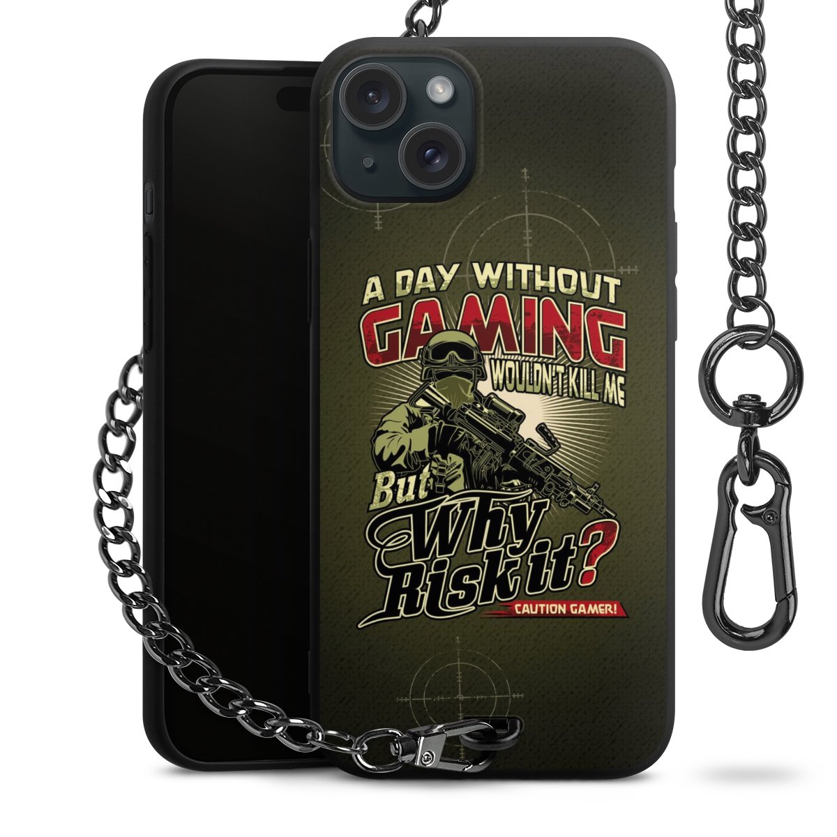 Die mattschwarze Silikon-Handyhülle besteht aus robustem TPU (thermoplastisches Polyurethan). Sie ist flexibel und schützt Dein Smartphone vor Stößen und Kratzern. Die Kette sowie der Karabinerhaken sind aus Metall in Gunmetal-Optik gefertigt. Für dieses Produkt kommen ausschließlich TÜV-geprüfte Materialien zum Einsatz.