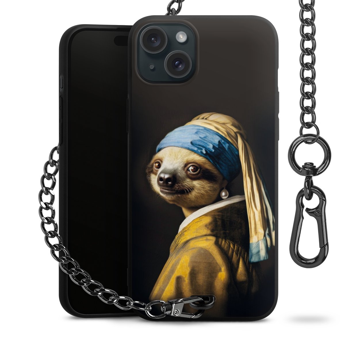 Die Handyhülle verfügt über eine mittig am unteren Rand platzierte Öse, an der die Metallkette stabil befestigt ist. Bestelle die Hülle einfach für Dein Smartphone-Modell, dann passt sie wie angegossen und Du brauchst sie bloß einmal anzudrücken. Handy in die Tasche, Karabiner an den Hosenbund – schon kann die Party starten.