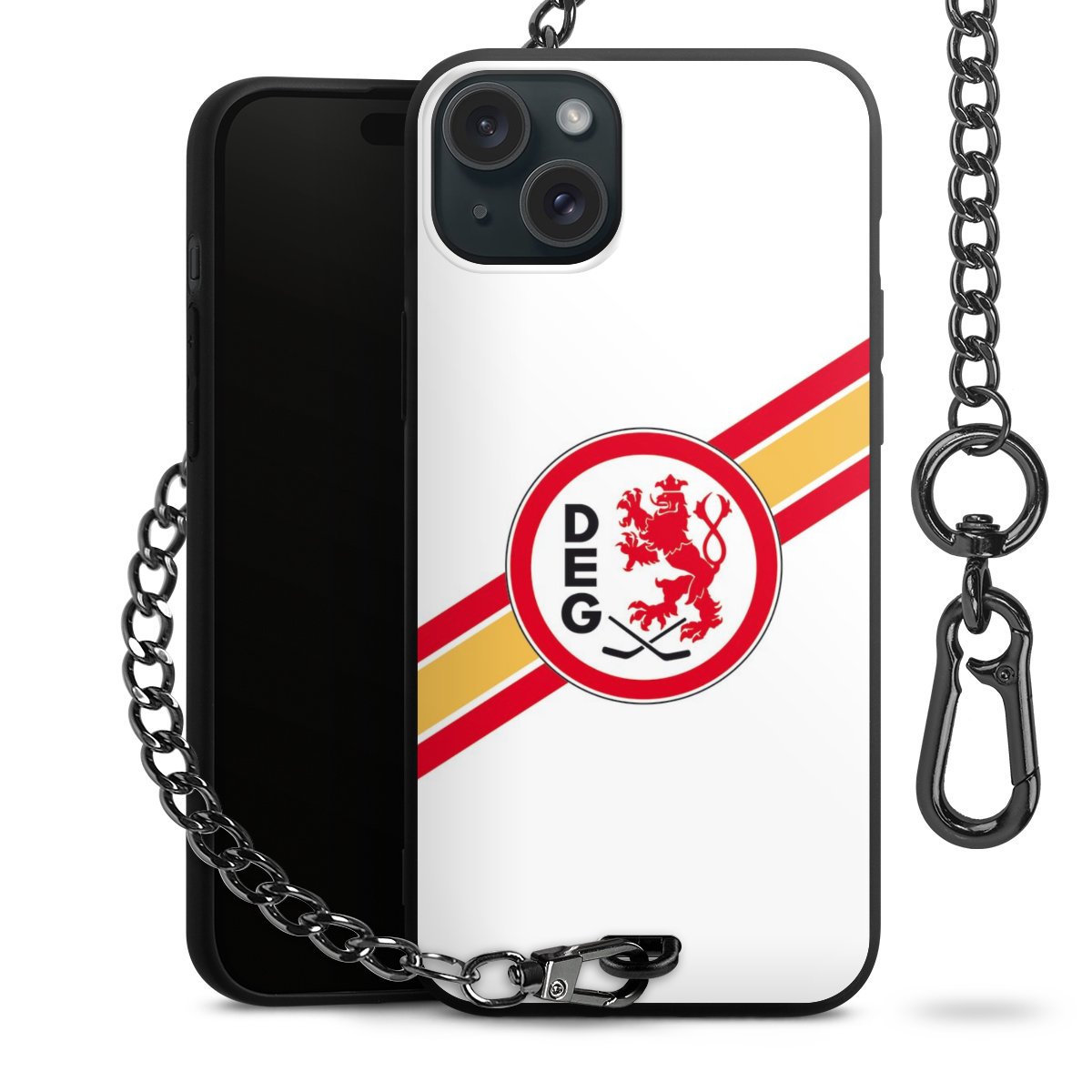 Die mattschwarze Silikon-Handyhülle besteht aus robustem TPU (thermoplastisches Polyurethan). Sie ist flexibel und schützt Dein Smartphone vor Stößen und Kratzern. Die Kette sowie der Karabinerhaken sind aus Metall in Gunmetal-Optik gefertigt. Für dieses Produkt kommen ausschließlich TÜV-geprüfte Materialien zum Einsatz.