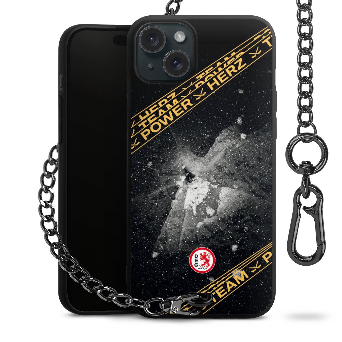 Die mattschwarze Silikon-Handyhülle besteht aus robustem TPU (thermoplastisches Polyurethan). Sie ist flexibel und schützt Dein Smartphone vor Stößen und Kratzern. Die Kette sowie der Karabinerhaken sind aus Metall in Gunmetal-Optik gefertigt. Für dieses Produkt kommen ausschließlich TÜV-geprüfte Materialien zum Einsatz.