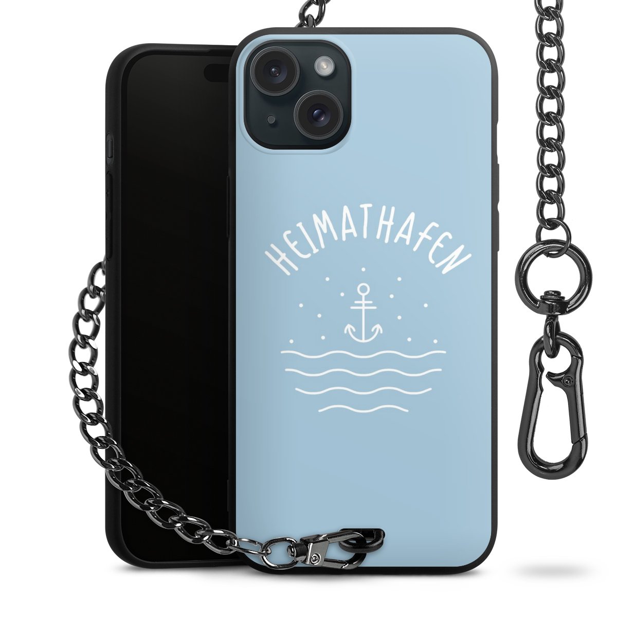 Die mattschwarze Silikon-Handyhülle besteht aus robustem TPU (thermoplastisches Polyurethan). Sie ist flexibel und schützt Dein Smartphone vor Stößen und Kratzern. Die Kette sowie der Karabinerhaken sind aus Metall in Gunmetal-Optik gefertigt. Für dieses Produkt kommen ausschließlich TÜV-geprüfte Materialien zum Einsatz.