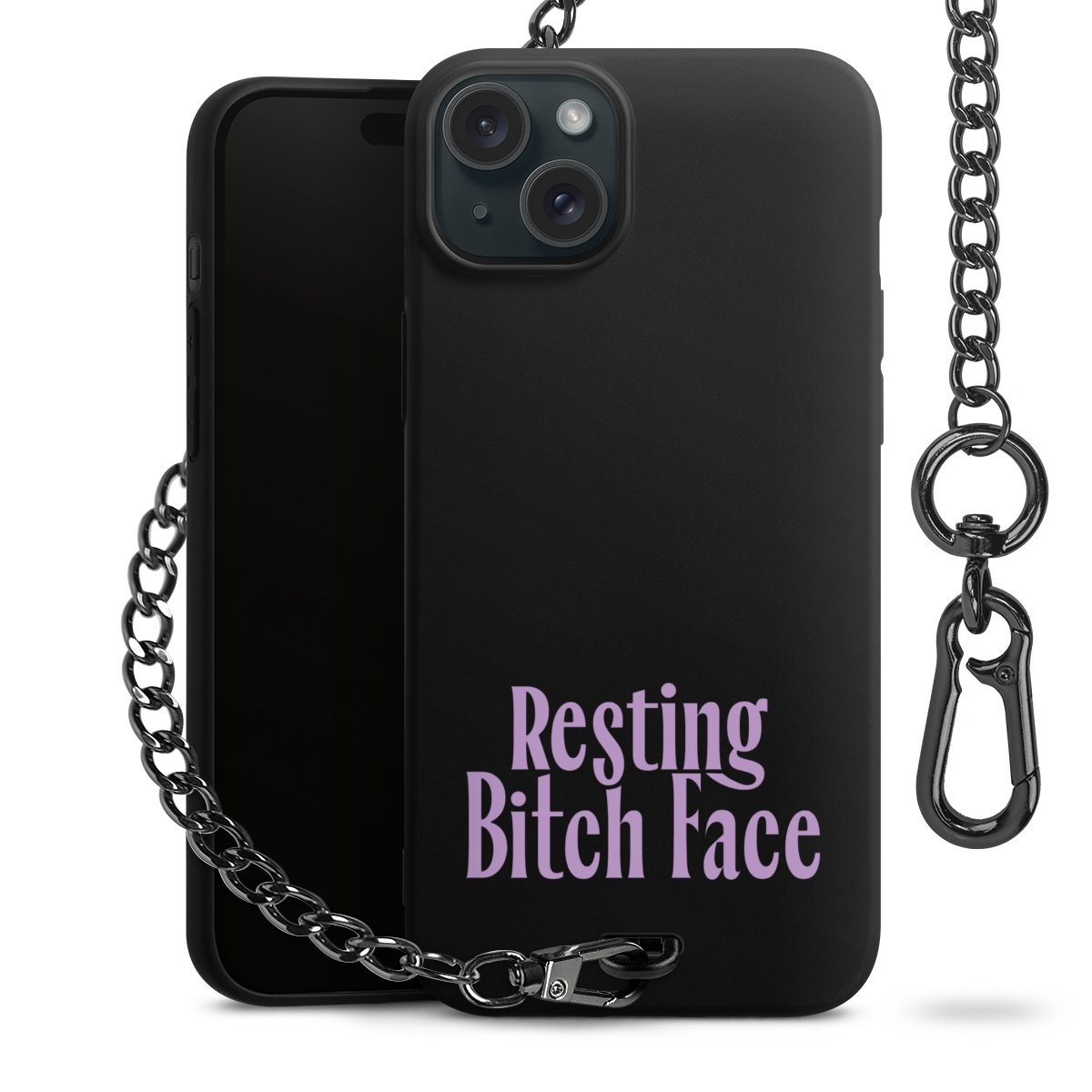 Die mattschwarze Silikon-Handyhülle besteht aus robustem TPU (thermoplastisches Polyurethan). Sie ist flexibel und schützt Dein Smartphone vor Stößen und Kratzern. Die Kette sowie der Karabinerhaken sind aus Metall in Gunmetal-Optik gefertigt. Für dieses Produkt kommen ausschließlich TÜV-geprüfte Materialien zum Einsatz.