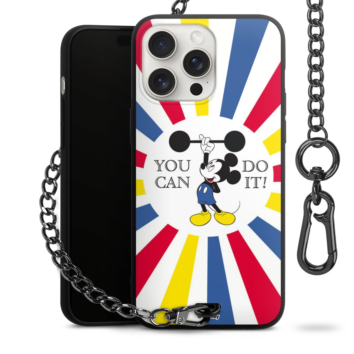 Die Handyhülle verfügt über eine mittig am unteren Rand platzierte Öse, an der die Metallkette stabil befestigt ist. Bestelle die Hülle einfach für Dein Smartphone-Modell, dann passt sie wie angegossen und Du brauchst sie bloß einmal anzudrücken. Handy in die Tasche, Karabiner an den Hosenbund – schon kann die Party starten.