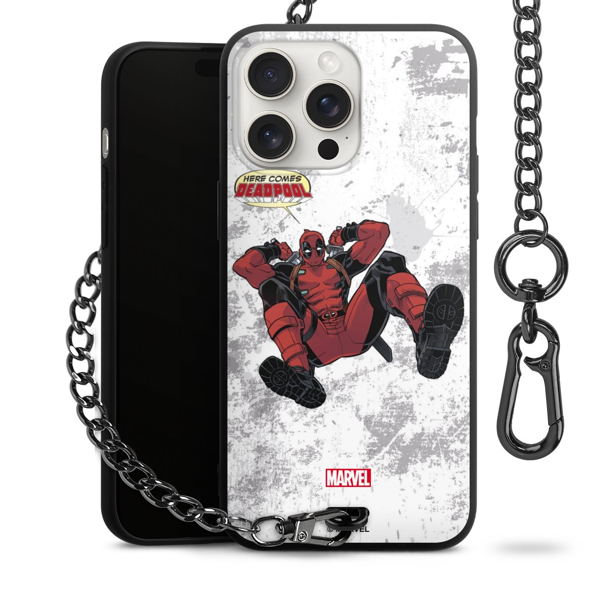 Die mattschwarze Silikon-Handyhülle besteht aus robustem TPU (thermoplastisches Polyurethan). Sie ist flexibel und schützt Dein Smartphone vor Stößen und Kratzern. Die Kette sowie der Karabinerhaken sind aus Metall in Gunmetal-Optik gefertigt. Für dieses Produkt kommen ausschließlich TÜV-geprüfte Materialien zum Einsatz.