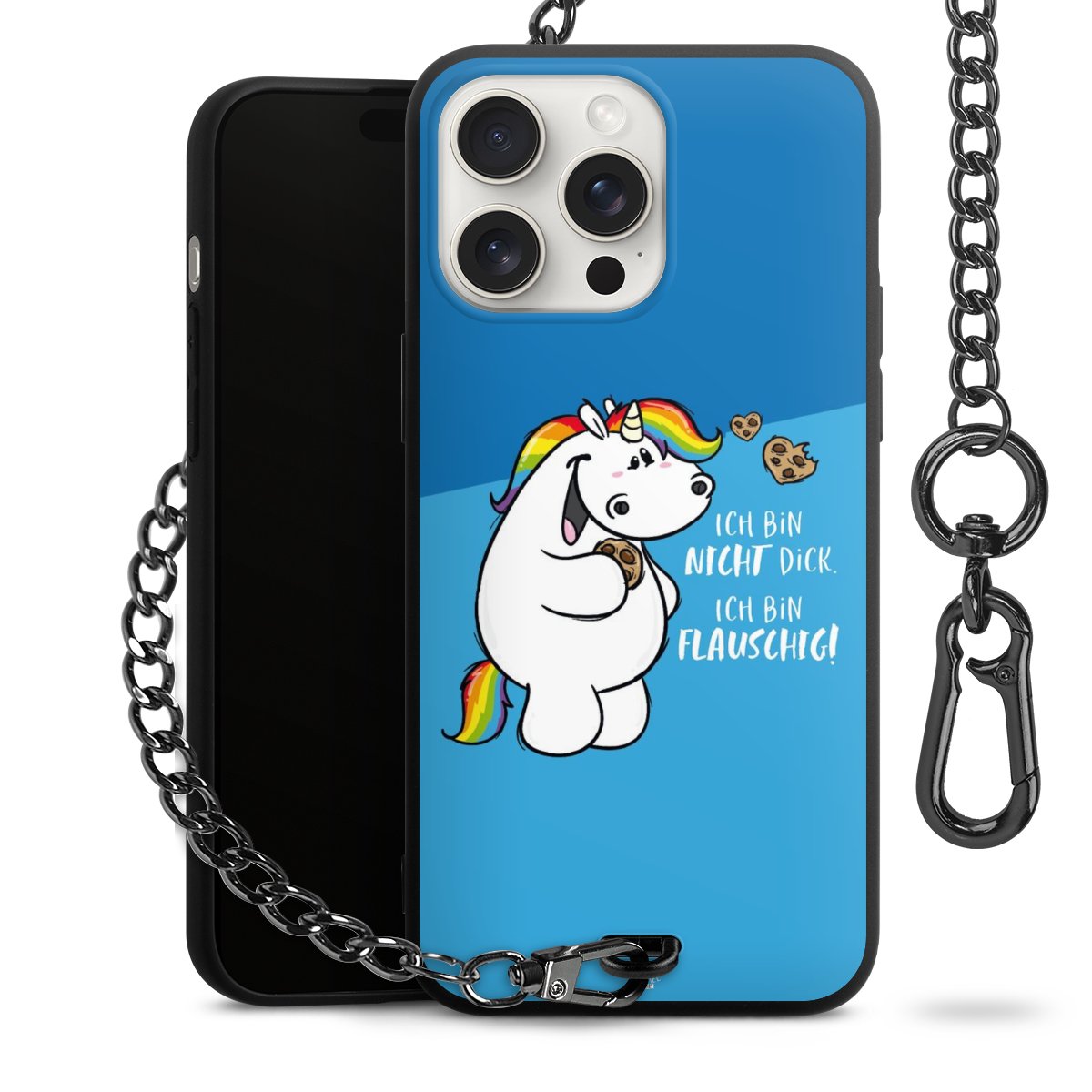 Die mattschwarze Silikon-Handyhülle besteht aus robustem TPU (thermoplastisches Polyurethan). Sie ist flexibel und schützt Dein Smartphone vor Stößen und Kratzern. Die Kette sowie der Karabinerhaken sind aus Metall in Gunmetal-Optik gefertigt. Für dieses Produkt kommen ausschließlich TÜV-geprüfte Materialien zum Einsatz.