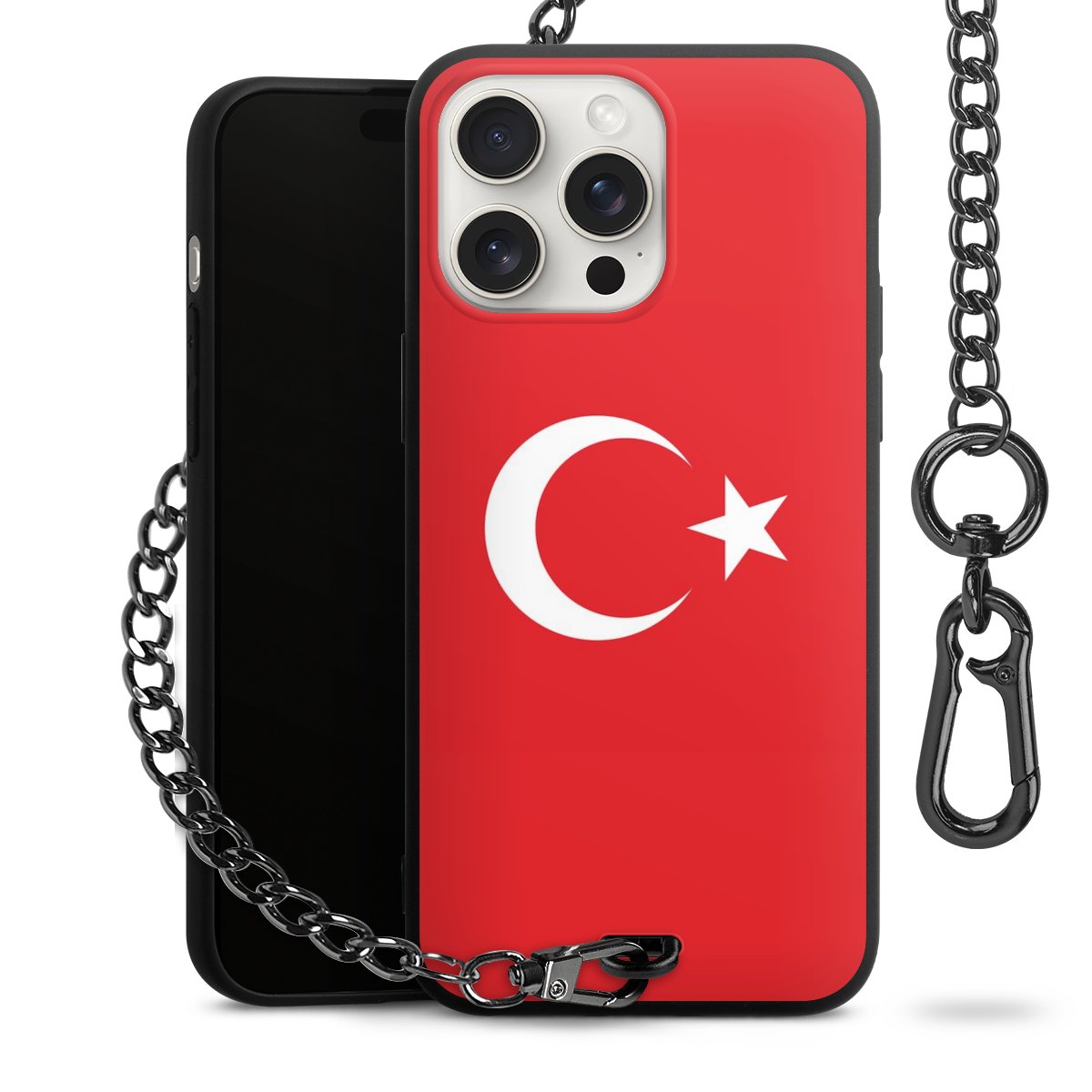 Die mattschwarze Silikon-Handyhülle besteht aus robustem TPU (thermoplastisches Polyurethan). Sie ist flexibel und schützt Dein Smartphone vor Stößen und Kratzern. Die Kette sowie der Karabinerhaken sind aus Metall in Gunmetal-Optik gefertigt. Für dieses Produkt kommen ausschließlich TÜV-geprüfte Materialien zum Einsatz.