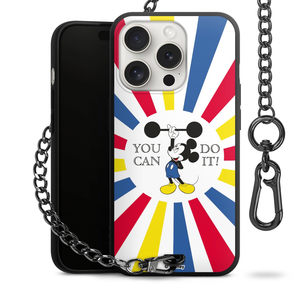 Die Handyhülle verfügt über eine mittig am unteren Rand platzierte Öse, an der die Metallkette stabil befestigt ist. Bestelle die Hülle einfach für Dein Smartphone-Modell, dann passt sie wie angegossen und Du brauchst sie bloß einmal anzudrücken. Handy in die Tasche, Karabiner an den Hosenbund – schon kann die Party starten.