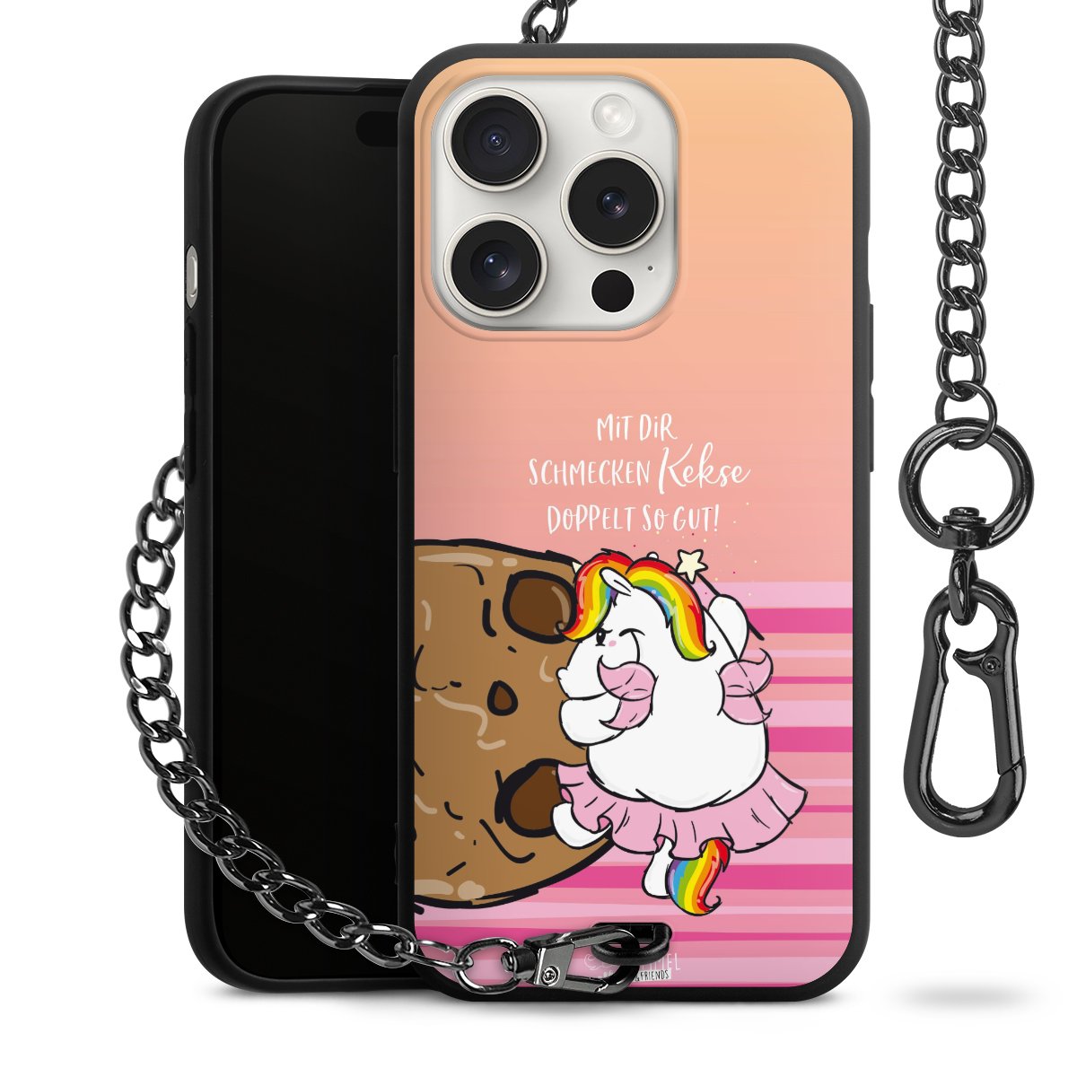 Die mattschwarze Silikon-Handyhülle besteht aus robustem TPU (thermoplastisches Polyurethan). Sie ist flexibel und schützt Dein Smartphone vor Stößen und Kratzern. Die Kette sowie der Karabinerhaken sind aus Metall in Gunmetal-Optik gefertigt. Für dieses Produkt kommen ausschließlich TÜV-geprüfte Materialien zum Einsatz.