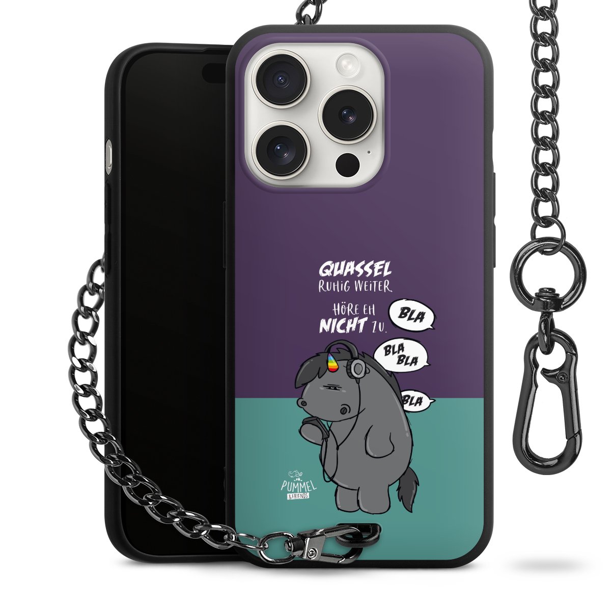 Die mattschwarze Silikon-Handyhülle besteht aus robustem TPU (thermoplastisches Polyurethan). Sie ist flexibel und schützt Dein Smartphone vor Stößen und Kratzern. Die Kette sowie der Karabinerhaken sind aus Metall in Gunmetal-Optik gefertigt. Für dieses Produkt kommen ausschließlich TÜV-geprüfte Materialien zum Einsatz.