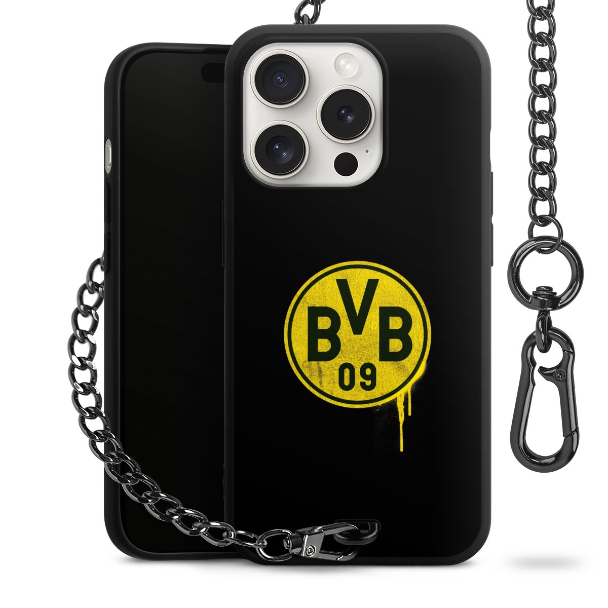 Die mattschwarze Silikon-Handyhülle besteht aus robustem TPU (thermoplastisches Polyurethan). Sie ist flexibel und schützt Dein Smartphone vor Stößen und Kratzern. Die Kette sowie der Karabinerhaken sind aus Metall in Gunmetal-Optik gefertigt. Für dieses Produkt kommen ausschließlich TÜV-geprüfte Materialien zum Einsatz.