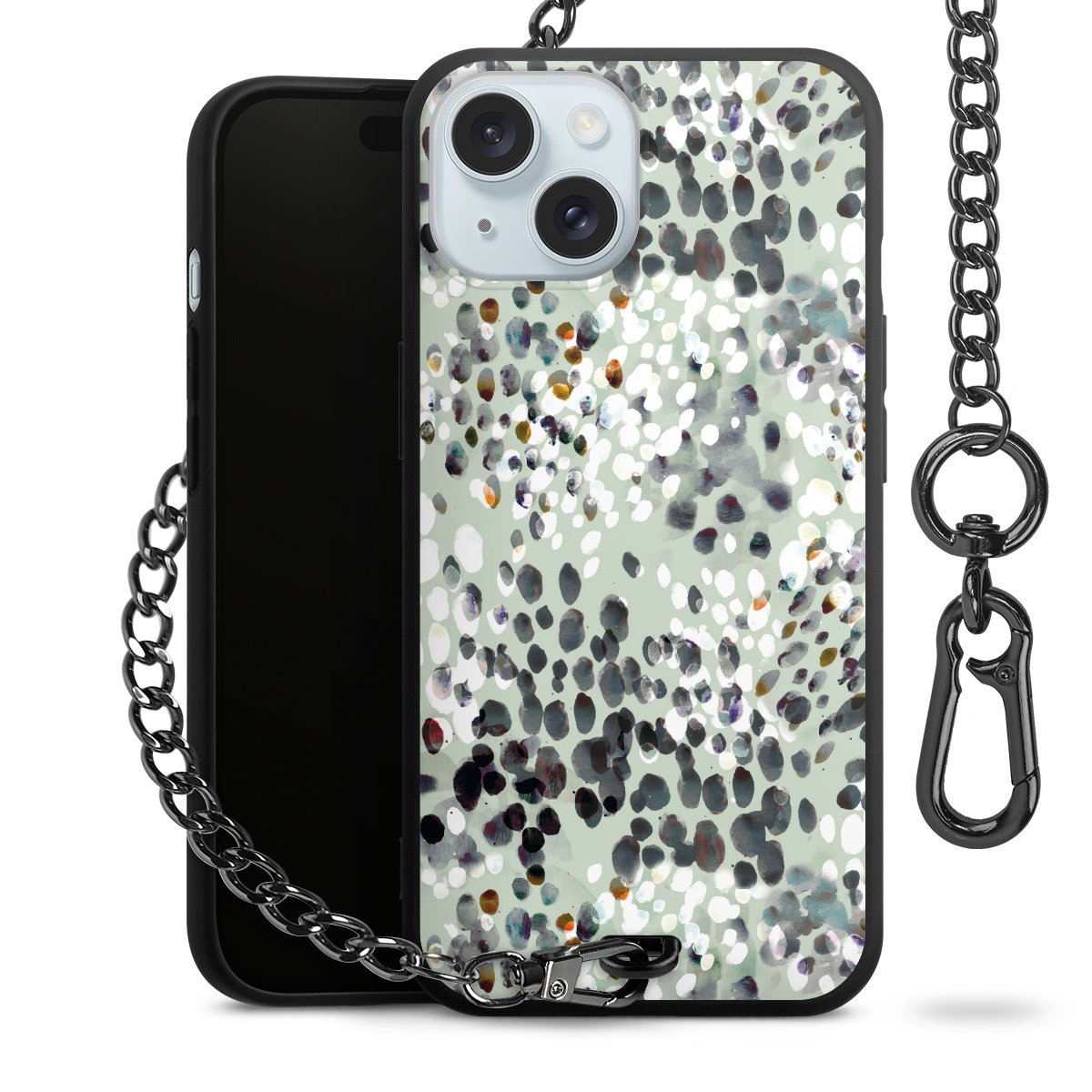 Die mattschwarze Silikon-Handyhülle besteht aus robustem TPU (thermoplastisches Polyurethan). Sie ist flexibel und schützt Dein Smartphone vor Stößen und Kratzern. Die Kette sowie der Karabinerhaken sind aus Metall in Gunmetal-Optik gefertigt. Für dieses Produkt kommen ausschließlich TÜV-geprüfte Materialien zum Einsatz.