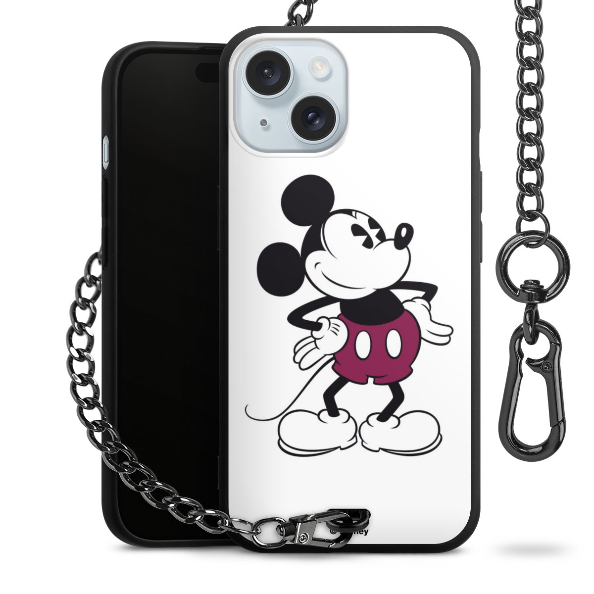 Die Handyhülle verfügt über eine mittig am unteren Rand platzierte Öse, an der die Metallkette stabil befestigt ist. Bestelle die Hülle einfach für Dein Smartphone-Modell, dann passt sie wie angegossen und Du brauchst sie bloß einmal anzudrücken. Handy in die Tasche, Karabiner an den Hosenbund – schon kann die Party starten.