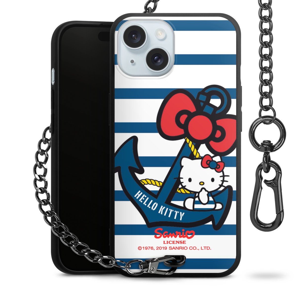 Die Handyhülle verfügt über eine mittig am unteren Rand platzierte Öse, an der die Metallkette stabil befestigt ist. Bestelle die Hülle einfach für Dein Smartphone-Modell, dann passt sie wie angegossen und Du brauchst sie bloß einmal anzudrücken. Handy in die Tasche, Karabiner an den Hosenbund – schon kann die Party starten.