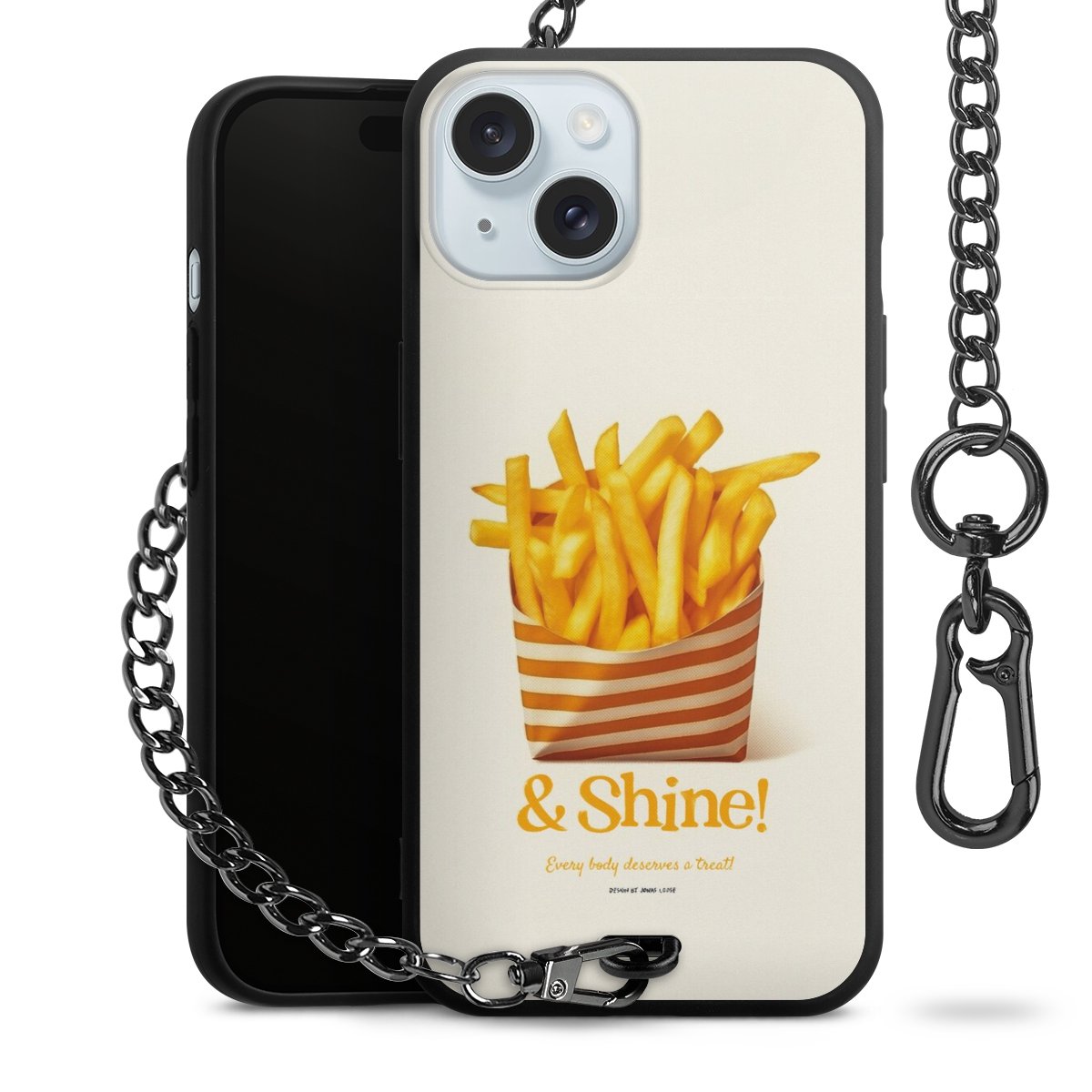 Die Handyhülle verfügt über eine mittig am unteren Rand platzierte Öse, an der die Metallkette stabil befestigt ist. Bestelle die Hülle einfach für Dein Smartphone-Modell, dann passt sie wie angegossen und Du brauchst sie bloß einmal anzudrücken. Handy in die Tasche, Karabiner an den Hosenbund – schon kann die Party starten.