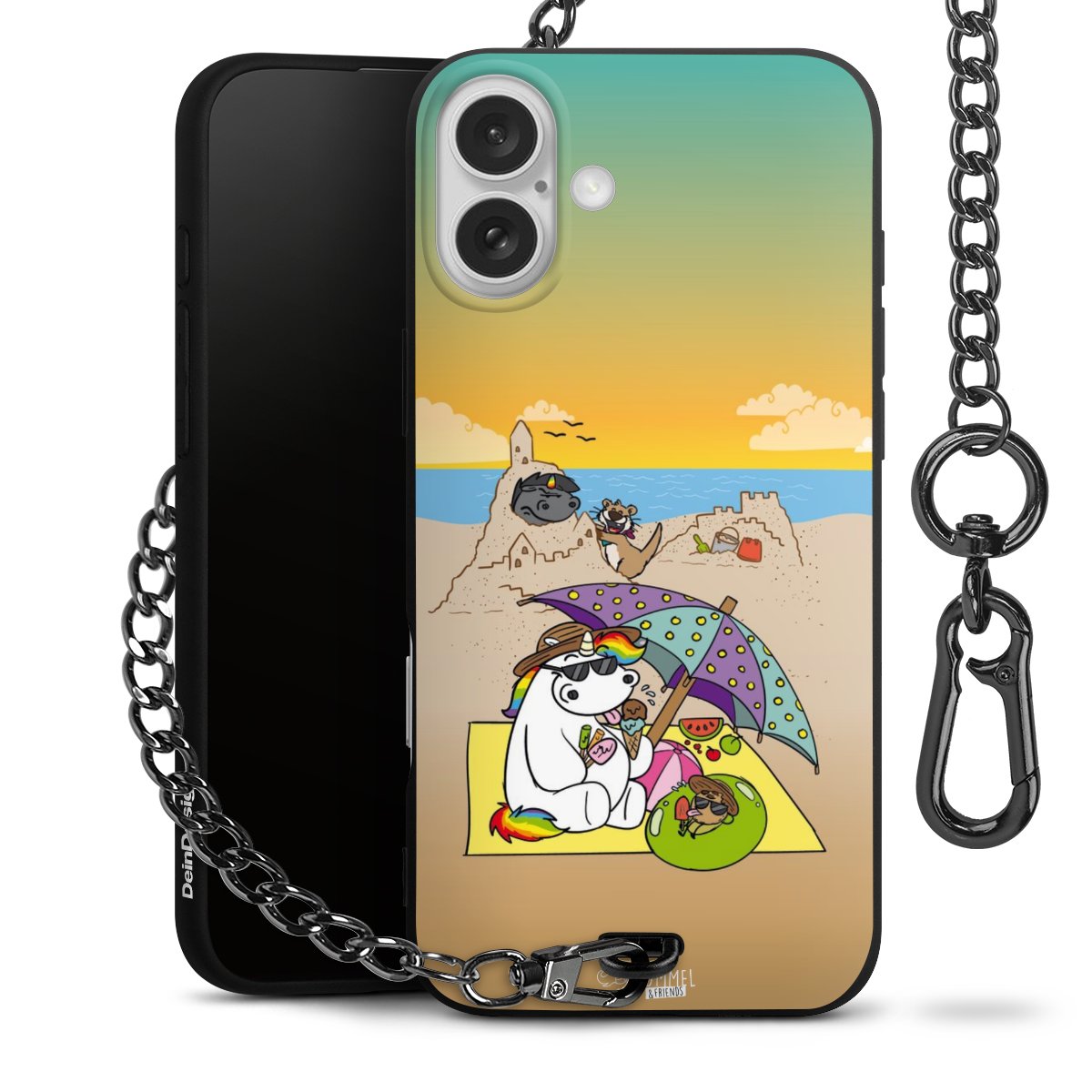 Die Handyhülle verfügt über eine mittig am unteren Rand platzierte Öse, an der die Metallkette stabil befestigt ist. Bestelle die Hülle einfach für Dein Smartphone-Modell, dann passt sie wie angegossen und Du brauchst sie bloß einmal anzudrücken. Handy in die Tasche, Karabiner an den Hosenbund – schon kann die Party starten.
