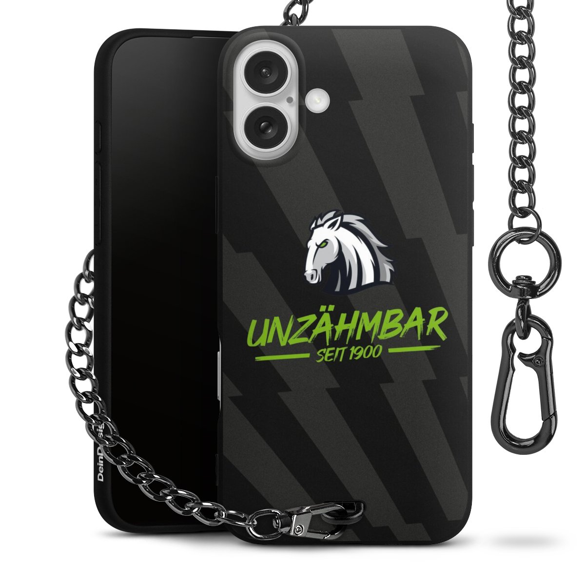 Die mattschwarze Silikon-Handyhülle besteht aus robustem TPU (thermoplastisches Polyurethan). Sie ist flexibel und schützt Dein Smartphone vor Stößen und Kratzern. Die Kette sowie der Karabinerhaken sind aus Metall in Gunmetal-Optik gefertigt. Für dieses Produkt kommen ausschließlich TÜV-geprüfte Materialien zum Einsatz.