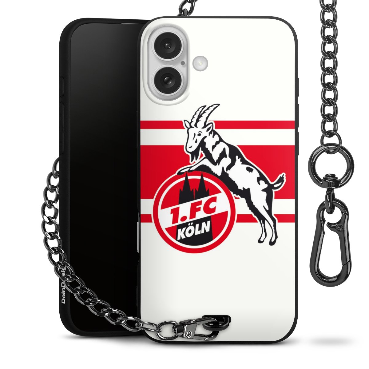 Die Handyhülle verfügt über eine mittig am unteren Rand platzierte Öse, an der die Metallkette stabil befestigt ist. Bestelle die Hülle einfach für Dein Smartphone-Modell, dann passt sie wie angegossen und Du brauchst sie bloß einmal anzudrücken. Handy in die Tasche, Karabiner an den Hosenbund – schon kann die Party starten.