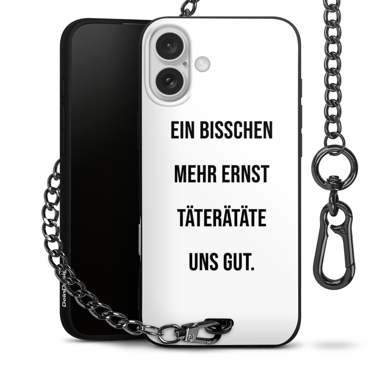 Die mattschwarze Silikon-Handyhülle besteht aus robustem TPU (thermoplastisches Polyurethan). Sie ist flexibel und schützt Dein Smartphone vor Stößen und Kratzern. Die Kette sowie der Karabinerhaken sind aus Metall in Gunmetal-Optik gefertigt. Für dieses Produkt kommen ausschließlich TÜV-geprüfte Materialien zum Einsatz.