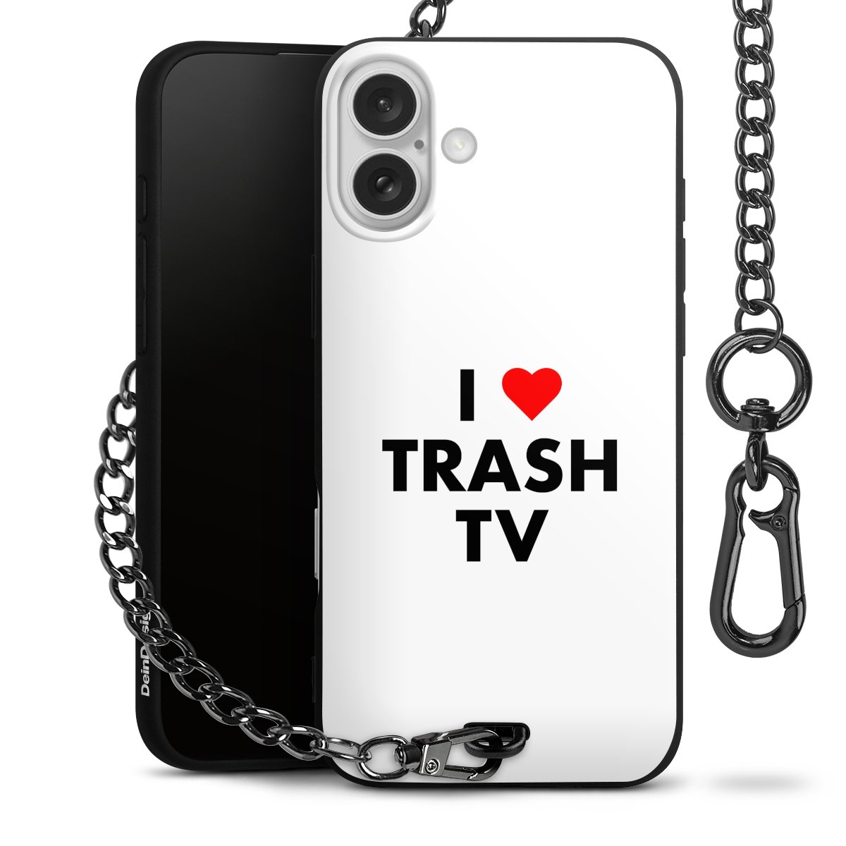 Die mattschwarze Silikon-Handyhülle besteht aus robustem TPU (thermoplastisches Polyurethan). Sie ist flexibel und schützt Dein Smartphone vor Stößen und Kratzern. Die Kette sowie der Karabinerhaken sind aus Metall in Gunmetal-Optik gefertigt. Für dieses Produkt kommen ausschließlich TÜV-geprüfte Materialien zum Einsatz.