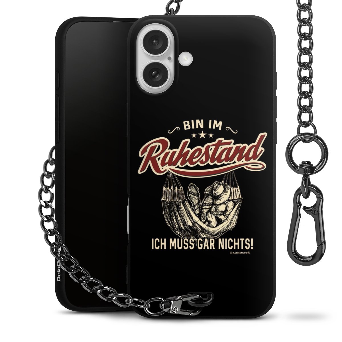 Die mattschwarze Silikon-Handyhülle besteht aus robustem TPU (thermoplastisches Polyurethan). Sie ist flexibel und schützt Dein Smartphone vor Stößen und Kratzern. Die Kette sowie der Karabinerhaken sind aus Metall in Gunmetal-Optik gefertigt. Für dieses Produkt kommen ausschließlich TÜV-geprüfte Materialien zum Einsatz.