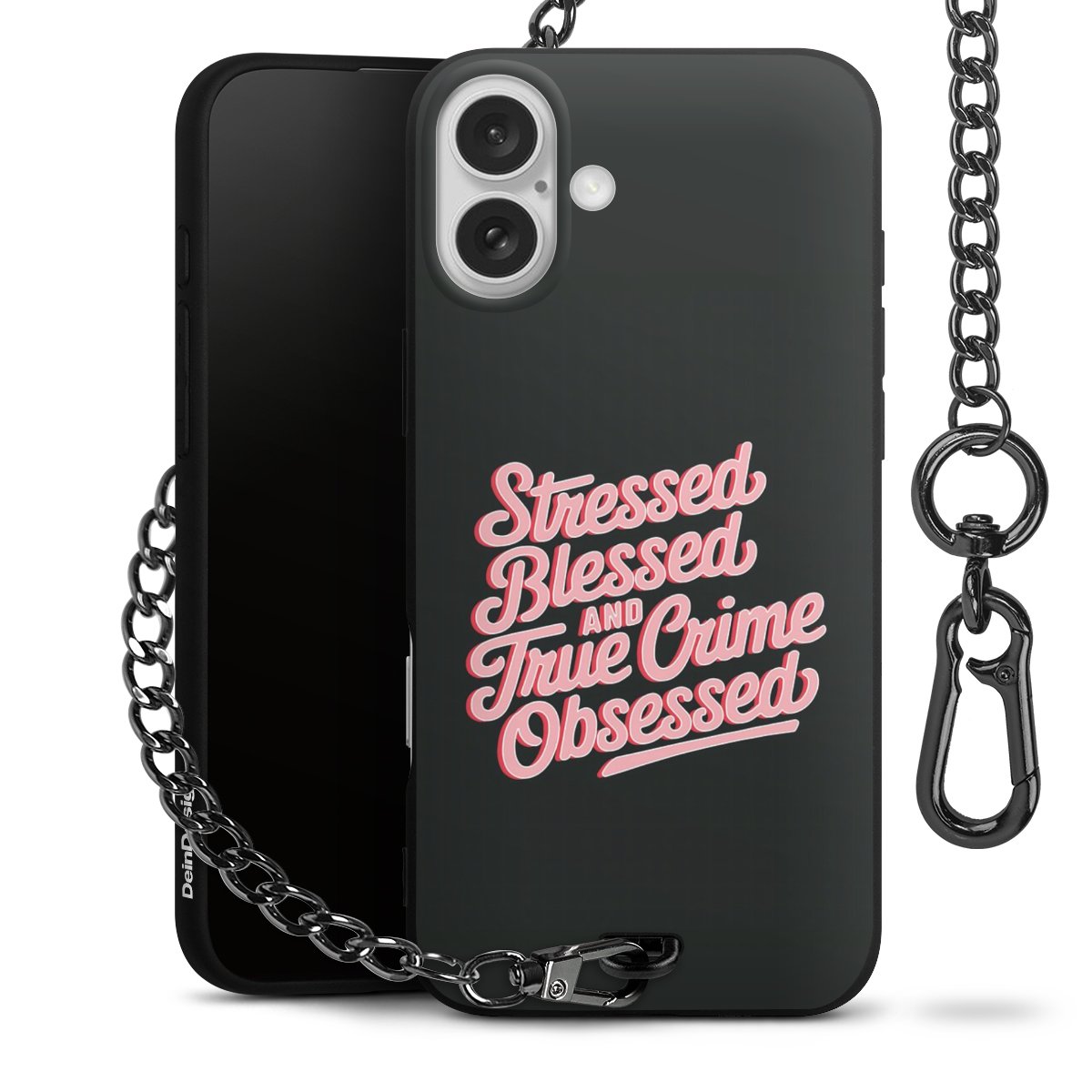 Die mattschwarze Silikon-Handyhülle besteht aus robustem TPU (thermoplastisches Polyurethan). Sie ist flexibel und schützt Dein Smartphone vor Stößen und Kratzern. Die Kette sowie der Karabinerhaken sind aus Metall in Gunmetal-Optik gefertigt. Für dieses Produkt kommen ausschließlich TÜV-geprüfte Materialien zum Einsatz.