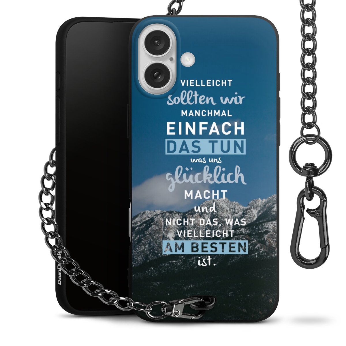 Die mattschwarze Silikon-Handyhülle besteht aus robustem TPU (thermoplastisches Polyurethan). Sie ist flexibel und schützt Dein Smartphone vor Stößen und Kratzern. Die Kette sowie der Karabinerhaken sind aus Metall in Gunmetal-Optik gefertigt. Für dieses Produkt kommen ausschließlich TÜV-geprüfte Materialien zum Einsatz.