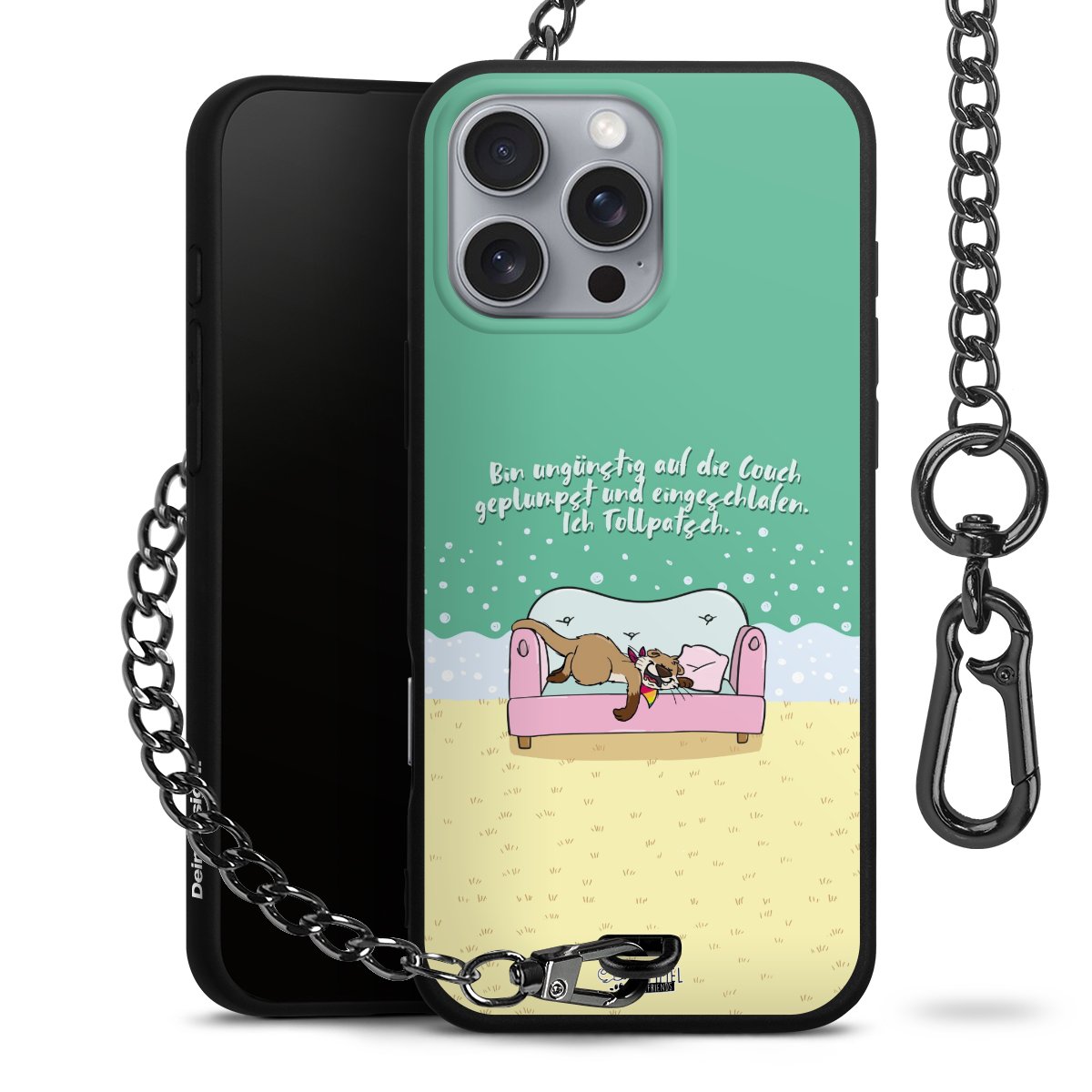 Die mattschwarze Silikon-Handyhülle besteht aus robustem TPU (thermoplastisches Polyurethan). Sie ist flexibel und schützt Dein Smartphone vor Stößen und Kratzern. Die Kette sowie der Karabinerhaken sind aus Metall in Gunmetal-Optik gefertigt. Für dieses Produkt kommen ausschließlich TÜV-geprüfte Materialien zum Einsatz.