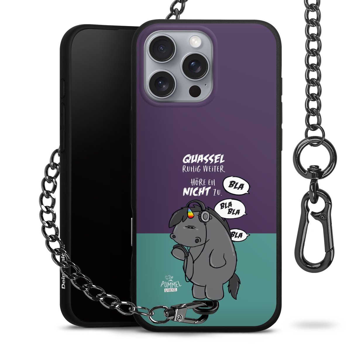 Die mattschwarze Silikon-Handyhülle besteht aus robustem TPU (thermoplastisches Polyurethan). Sie ist flexibel und schützt Dein Smartphone vor Stößen und Kratzern. Die Kette sowie der Karabinerhaken sind aus Metall in Gunmetal-Optik gefertigt. Für dieses Produkt kommen ausschließlich TÜV-geprüfte Materialien zum Einsatz.
