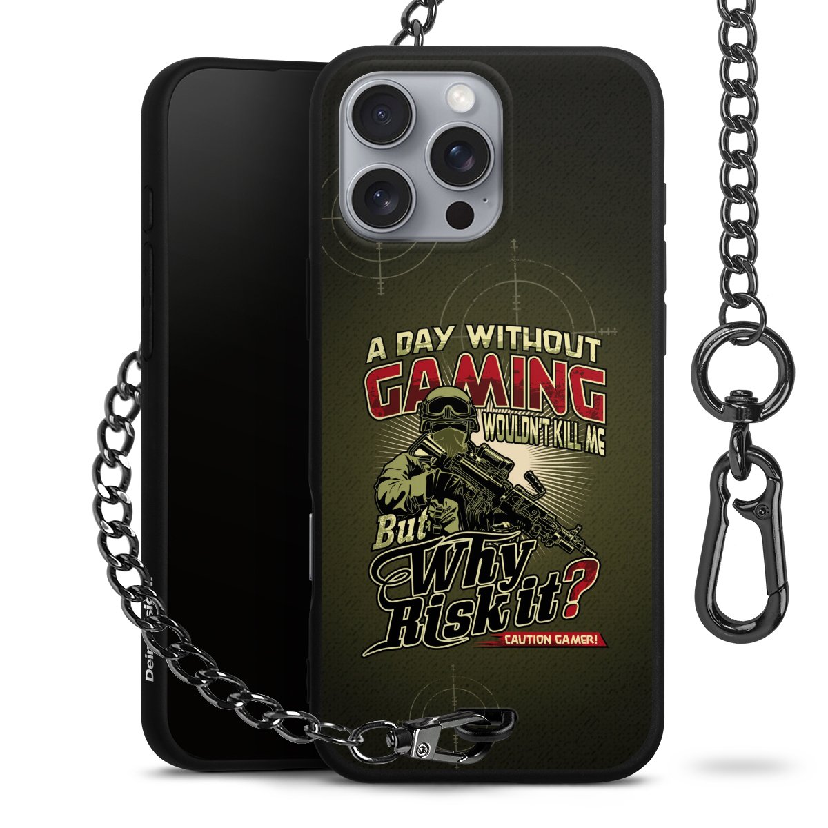 Die mattschwarze Silikon-Handyhülle besteht aus robustem TPU (thermoplastisches Polyurethan). Sie ist flexibel und schützt Dein Smartphone vor Stößen und Kratzern. Die Kette sowie der Karabinerhaken sind aus Metall in Gunmetal-Optik gefertigt. Für dieses Produkt kommen ausschließlich TÜV-geprüfte Materialien zum Einsatz.