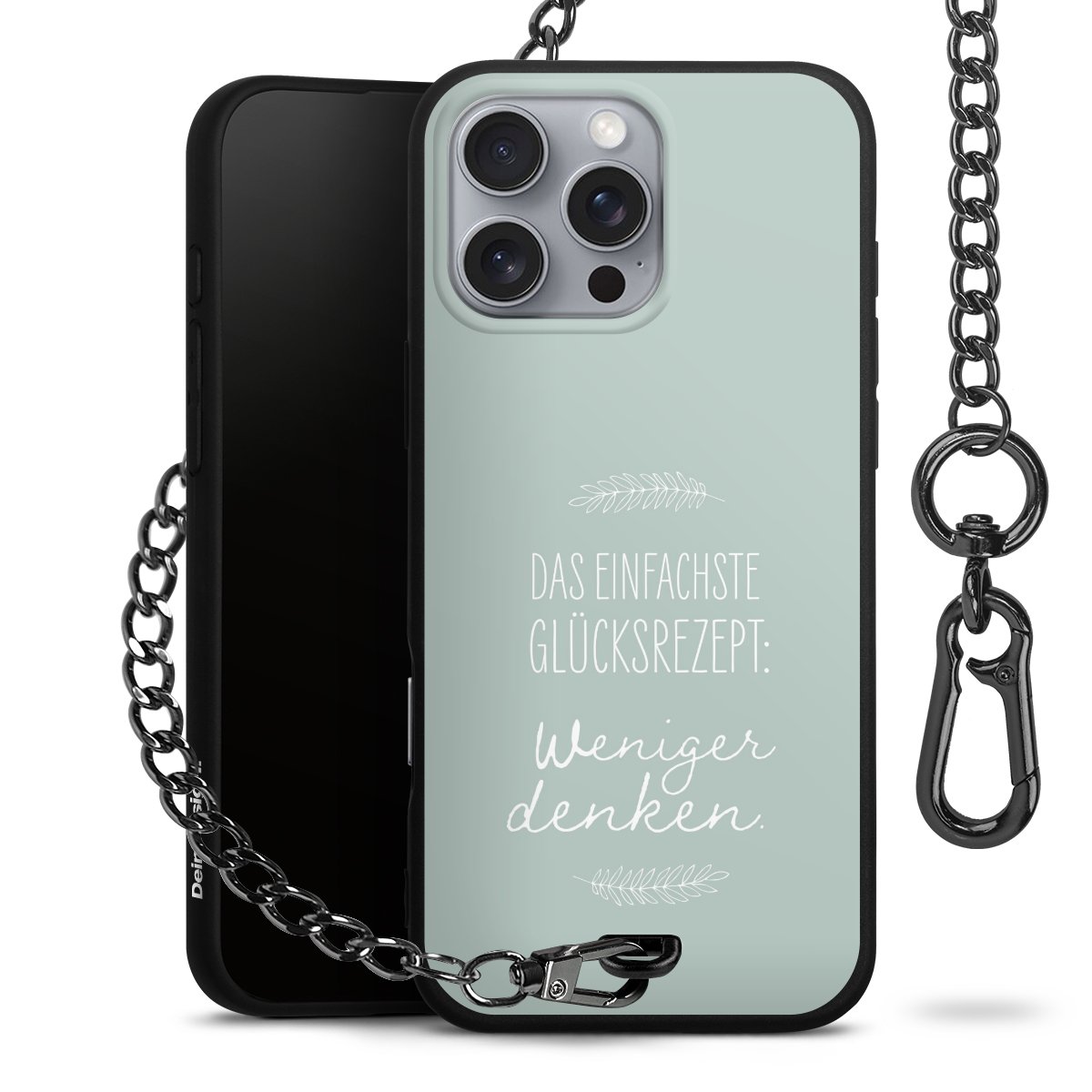 Die mattschwarze Silikon-Handyhülle besteht aus robustem TPU (thermoplastisches Polyurethan). Sie ist flexibel und schützt Dein Smartphone vor Stößen und Kratzern. Die Kette sowie der Karabinerhaken sind aus Metall in Gunmetal-Optik gefertigt. Für dieses Produkt kommen ausschließlich TÜV-geprüfte Materialien zum Einsatz.