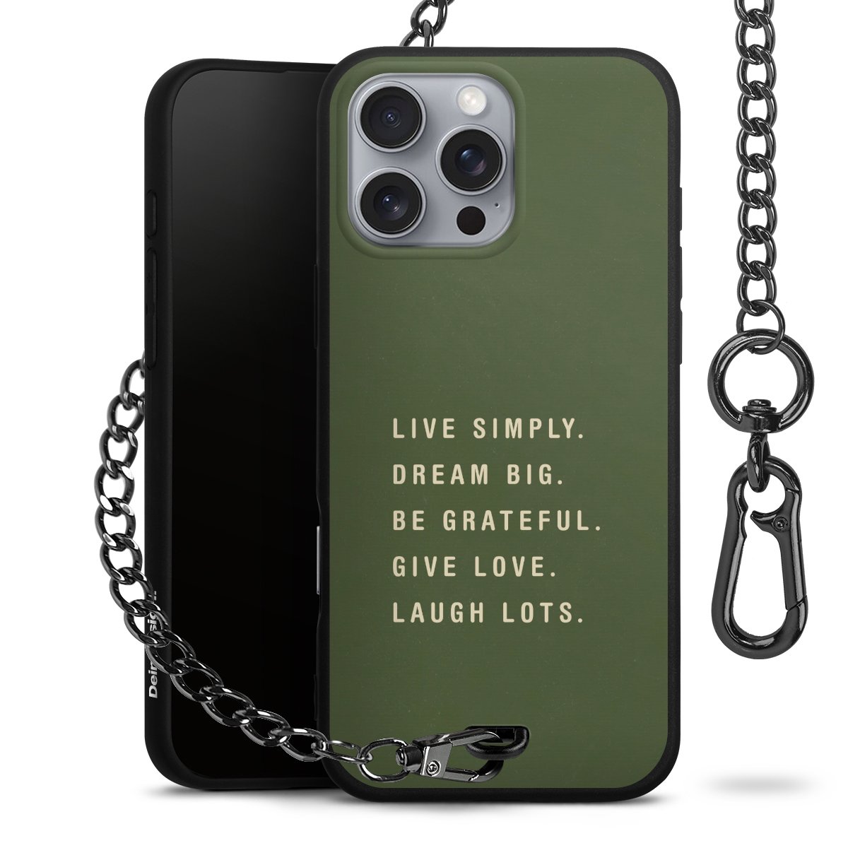 Die mattschwarze Silikon-Handyhülle besteht aus robustem TPU (thermoplastisches Polyurethan). Sie ist flexibel und schützt Dein Smartphone vor Stößen und Kratzern. Die Kette sowie der Karabinerhaken sind aus Metall in Gunmetal-Optik gefertigt. Für dieses Produkt kommen ausschließlich TÜV-geprüfte Materialien zum Einsatz.