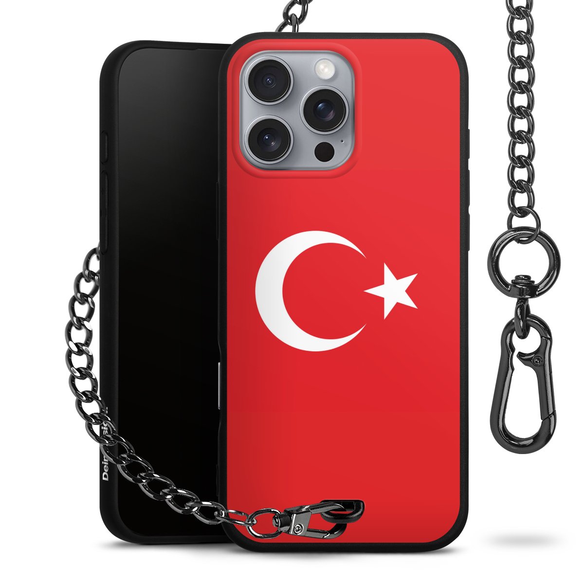 Die mattschwarze Silikon-Handyhülle besteht aus robustem TPU (thermoplastisches Polyurethan). Sie ist flexibel und schützt Dein Smartphone vor Stößen und Kratzern. Die Kette sowie der Karabinerhaken sind aus Metall in Gunmetal-Optik gefertigt. Für dieses Produkt kommen ausschließlich TÜV-geprüfte Materialien zum Einsatz.