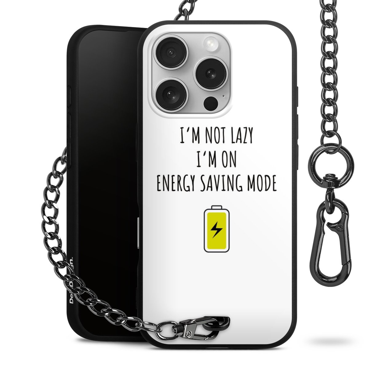 Die mattschwarze Silikon-Handyhülle besteht aus robustem TPU (thermoplastisches Polyurethan). Sie ist flexibel und schützt Dein Smartphone vor Stößen und Kratzern. Die Kette sowie der Karabinerhaken sind aus Metall in Gunmetal-Optik gefertigt. Für dieses Produkt kommen ausschließlich TÜV-geprüfte Materialien zum Einsatz.