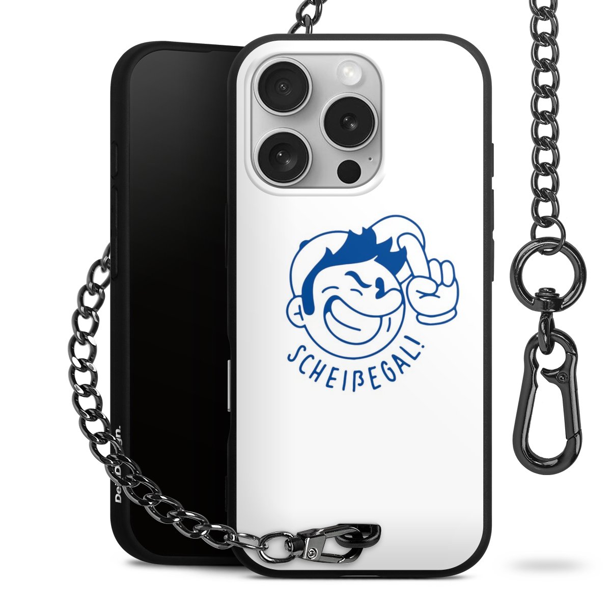 Die Handyhülle verfügt über eine mittig am unteren Rand platzierte Öse, an der die Metallkette stabil befestigt ist. Bestelle die Hülle einfach für Dein Smartphone-Modell, dann passt sie wie angegossen und Du brauchst sie bloß einmal anzudrücken. Handy in die Tasche, Karabiner an den Hosenbund – schon kann die Party starten.
