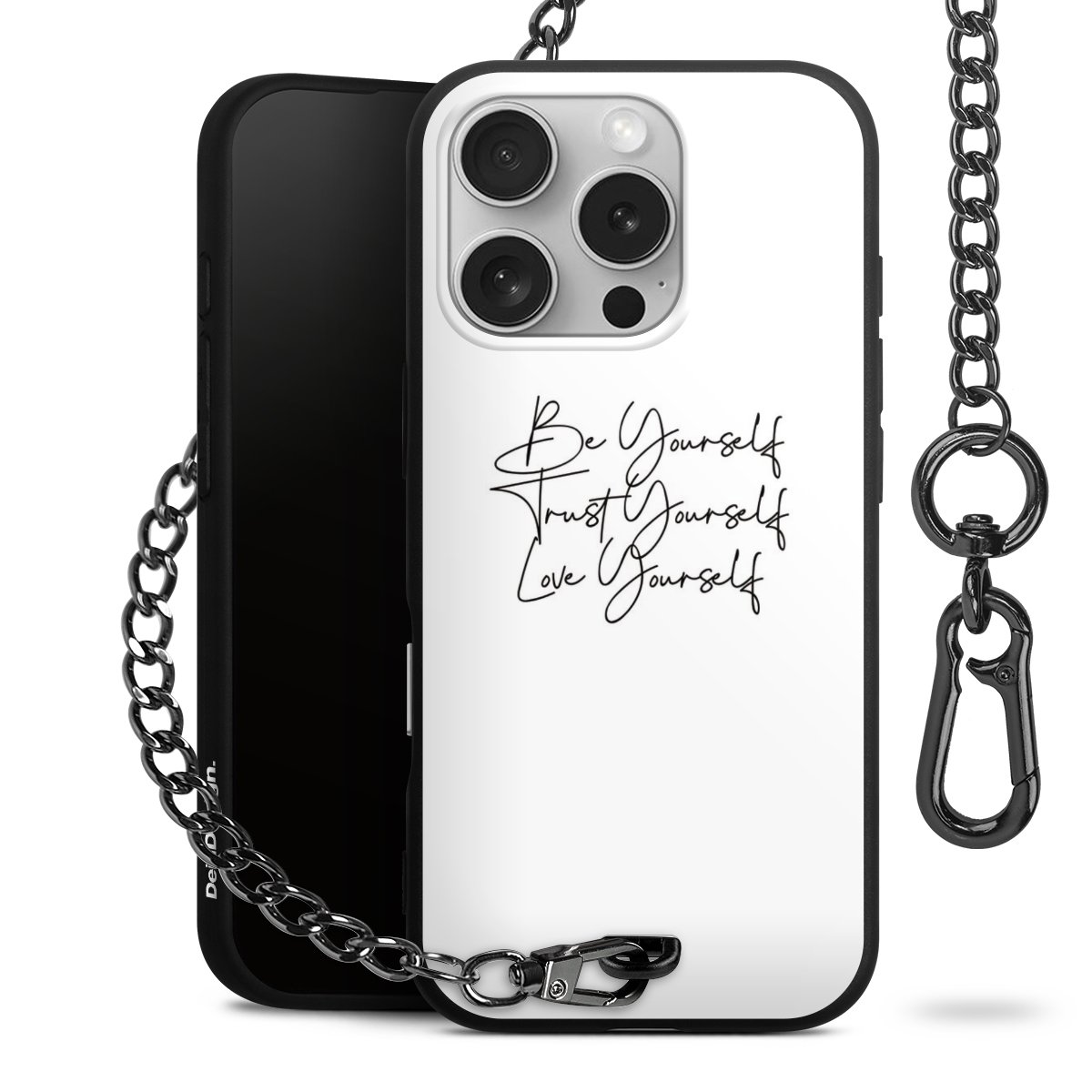 Die mattschwarze Silikon-Handyhülle besteht aus robustem TPU (thermoplastisches Polyurethan). Sie ist flexibel und schützt Dein Smartphone vor Stößen und Kratzern. Die Kette sowie der Karabinerhaken sind aus Metall in Gunmetal-Optik gefertigt. Für dieses Produkt kommen ausschließlich TÜV-geprüfte Materialien zum Einsatz.