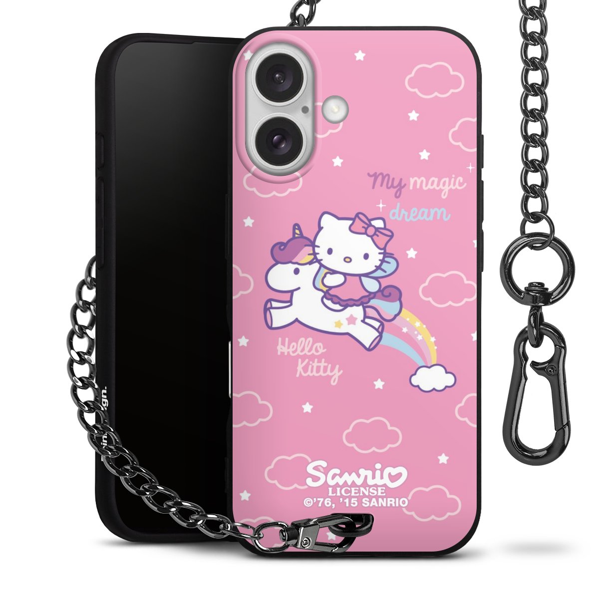 Die Handyhülle verfügt über eine mittig am unteren Rand platzierte Öse, an der die Metallkette stabil befestigt ist. Bestelle die Hülle einfach für Dein Smartphone-Modell, dann passt sie wie angegossen und Du brauchst sie bloß einmal anzudrücken. Handy in die Tasche, Karabiner an den Hosenbund – schon kann die Party starten.