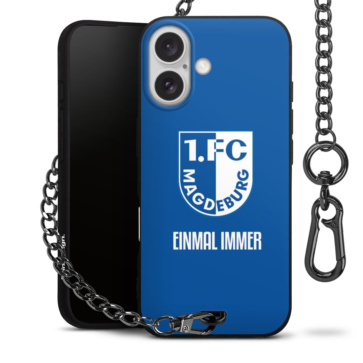 Die Handyhülle verfügt über eine mittig am unteren Rand platzierte Öse, an der die Metallkette stabil befestigt ist. Bestelle die Hülle einfach für Dein Smartphone-Modell, dann passt sie wie angegossen und Du brauchst sie bloß einmal anzudrücken. Handy in die Tasche, Karabiner an den Hosenbund – schon kann die Party starten.