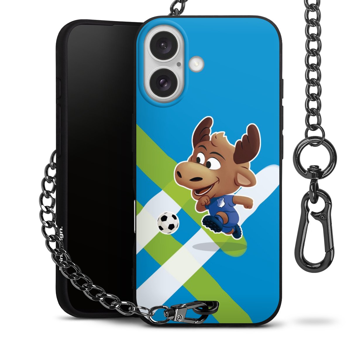 Die Handyhülle verfügt über eine mittig am unteren Rand platzierte Öse, an der die Metallkette stabil befestigt ist. Bestelle die Hülle einfach für Dein Smartphone-Modell, dann passt sie wie angegossen und Du brauchst sie bloß einmal anzudrücken. Handy in die Tasche, Karabiner an den Hosenbund – schon kann die Party starten.
