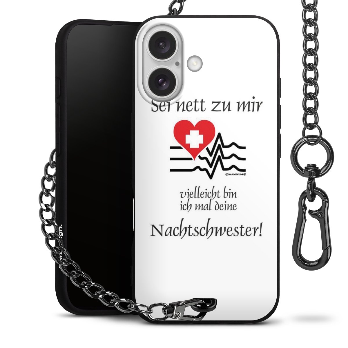 Die mattschwarze Silikon-Handyhülle besteht aus robustem TPU (thermoplastisches Polyurethan). Sie ist flexibel und schützt Dein Smartphone vor Stößen und Kratzern. Die Kette sowie der Karabinerhaken sind aus Metall in Gunmetal-Optik gefertigt. Für dieses Produkt kommen ausschließlich TÜV-geprüfte Materialien zum Einsatz.