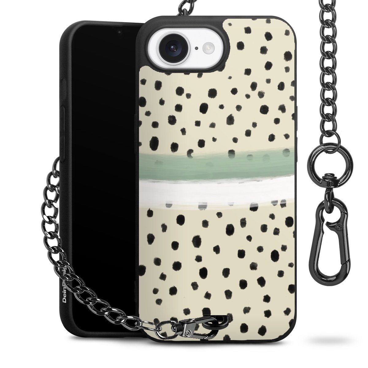 Die mattschwarze Silikon-Handyhülle besteht aus robustem TPU (thermoplastisches Polyurethan). Sie ist flexibel und schützt Dein Smartphone vor Stößen und Kratzern. Die Kette sowie der Karabinerhaken sind aus Metall in Gunmetal-Optik gefertigt. Für dieses Produkt kommen ausschließlich TÜV-geprüfte Materialien zum Einsatz.