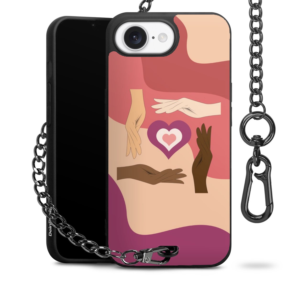 Die mattschwarze Silikon-Handyhülle besteht aus robustem TPU (thermoplastisches Polyurethan). Sie ist flexibel und schützt Dein Smartphone vor Stößen und Kratzern. Die Kette sowie der Karabinerhaken sind aus Metall in Gunmetal-Optik gefertigt. Für dieses Produkt kommen ausschließlich TÜV-geprüfte Materialien zum Einsatz.