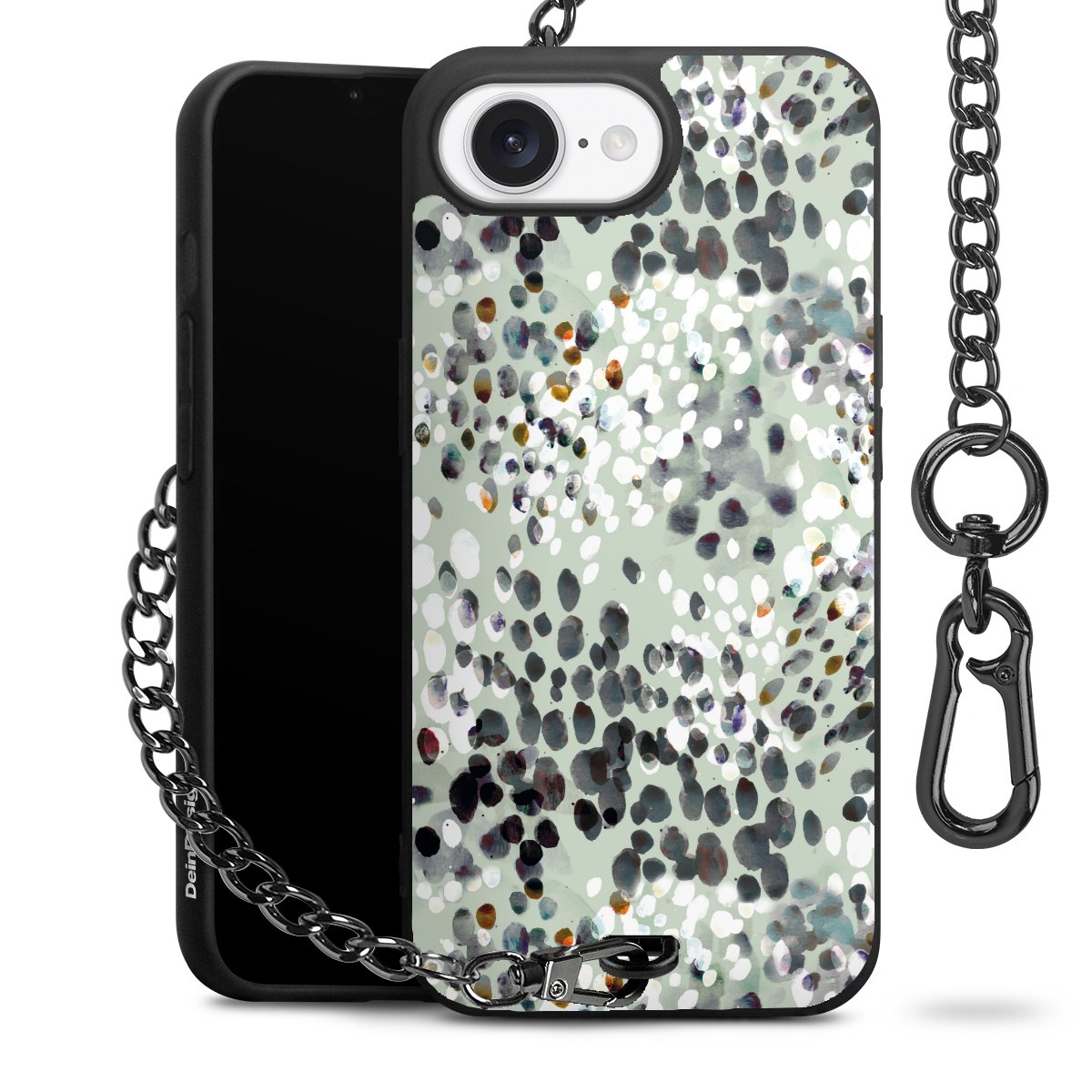 Die mattschwarze Silikon-Handyhülle besteht aus robustem TPU (thermoplastisches Polyurethan). Sie ist flexibel und schützt Dein Smartphone vor Stößen und Kratzern. Die Kette sowie der Karabinerhaken sind aus Metall in Gunmetal-Optik gefertigt. Für dieses Produkt kommen ausschließlich TÜV-geprüfte Materialien zum Einsatz.