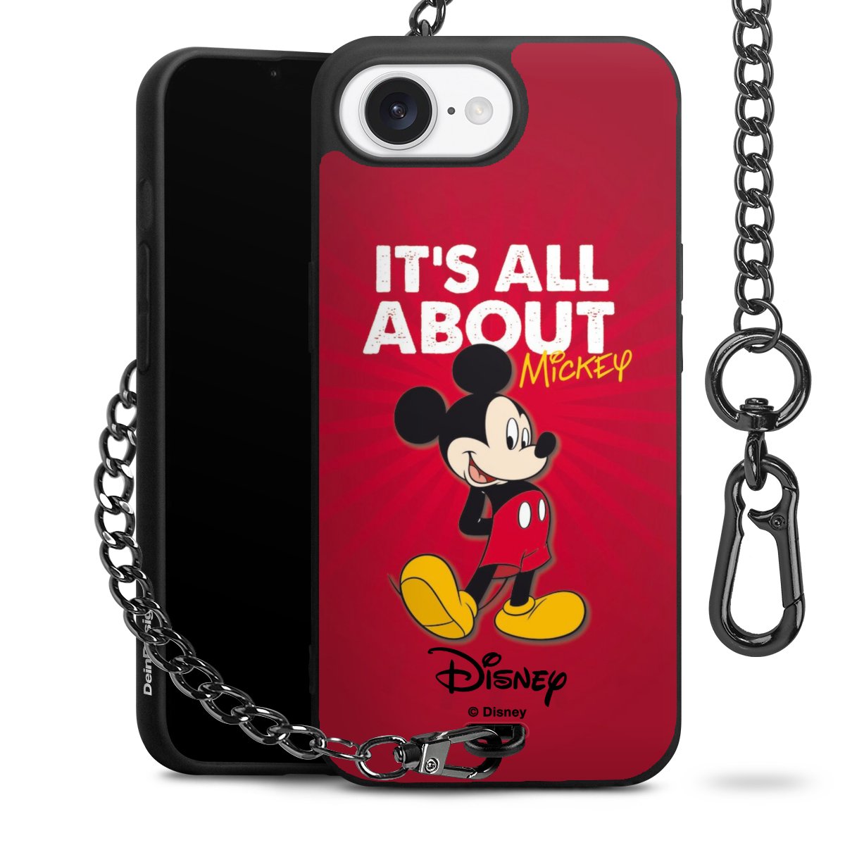 Die Handyhülle verfügt über eine mittig am unteren Rand platzierte Öse, an der die Metallkette stabil befestigt ist. Bestelle die Hülle einfach für Dein Smartphone-Modell, dann passt sie wie angegossen und Du brauchst sie bloß einmal anzudrücken. Handy in die Tasche, Karabiner an den Hosenbund – schon kann die Party starten.