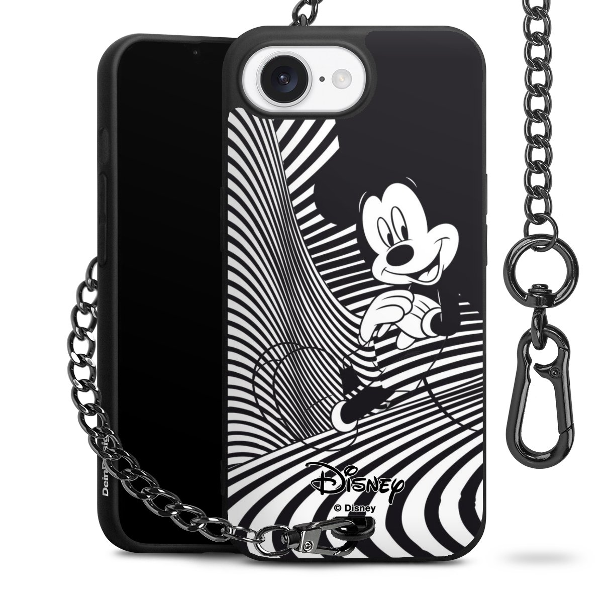Die Handyhülle verfügt über eine mittig am unteren Rand platzierte Öse, an der die Metallkette stabil befestigt ist. Bestelle die Hülle einfach für Dein Smartphone-Modell, dann passt sie wie angegossen und Du brauchst sie bloß einmal anzudrücken. Handy in die Tasche, Karabiner an den Hosenbund – schon kann die Party starten.